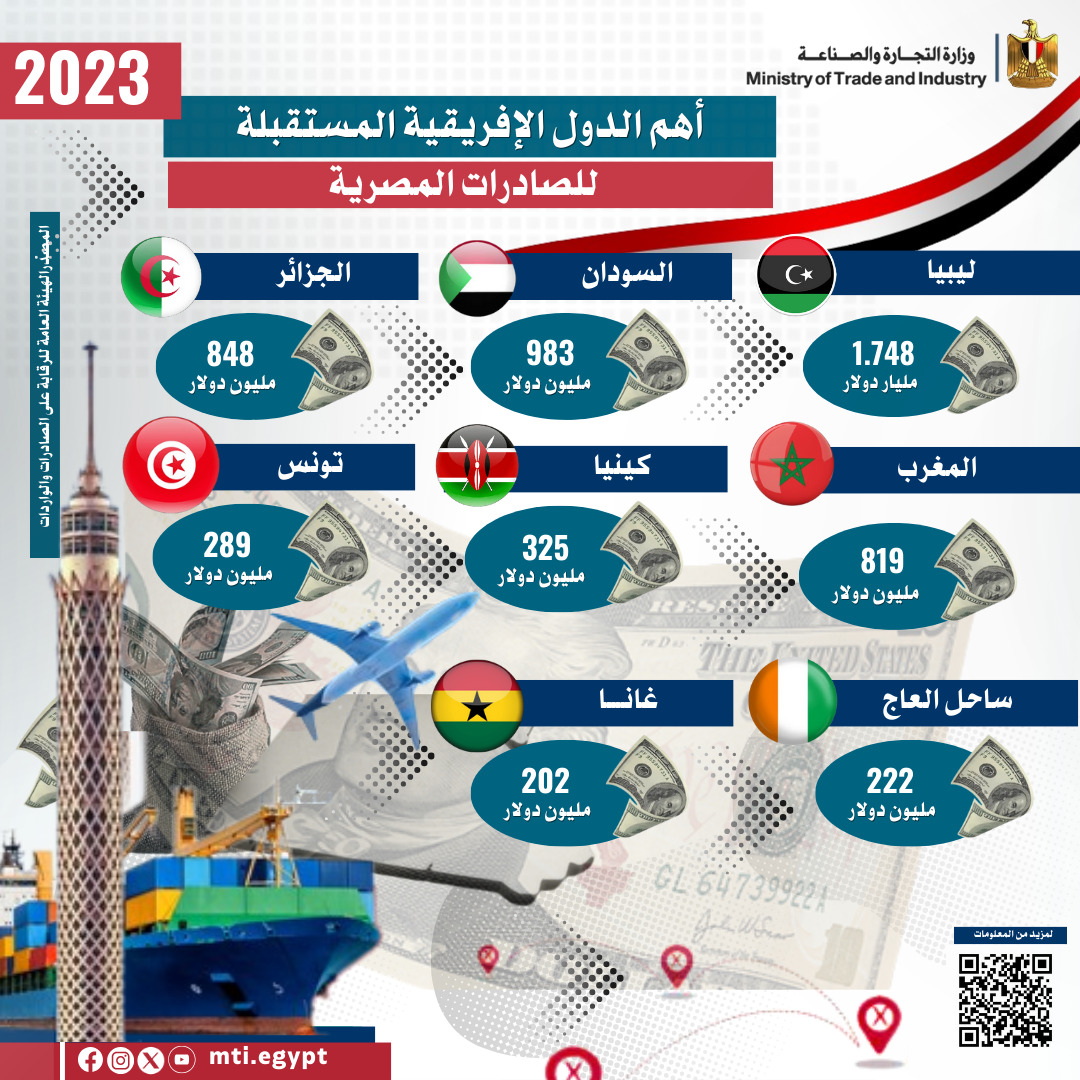وأضاف الوزير أن أهم الدول الإفريقية المستقبلة للصادرات المصرية خلال العام الماضي تضمنت ليبيا بقيمة مليار 760 مليون دولار والسودان بقيمة 988 مليون دولار والجزائر بقيمة 851 مليون دولار والمغرب بقيمة 817 مليون دولار وكينيا بقيمة 326 مليون دولار وتونس بقيمة 290 مليون دولار وساحل العاج بقيمة 223 مليون دولار وغانا بقيمة 203 مليون دولار، لافتاً إلى أن مواد البناء والصناعات الغذائية والمنتجات الكيماوية والاسمدة والسلع الهندسية والالكترونية والأثاث والصناعات الطبية والغزل والمنسوجات والملابس الجاهزة تمثل أبرز الصادرات المصرية إلى إفريقيا.