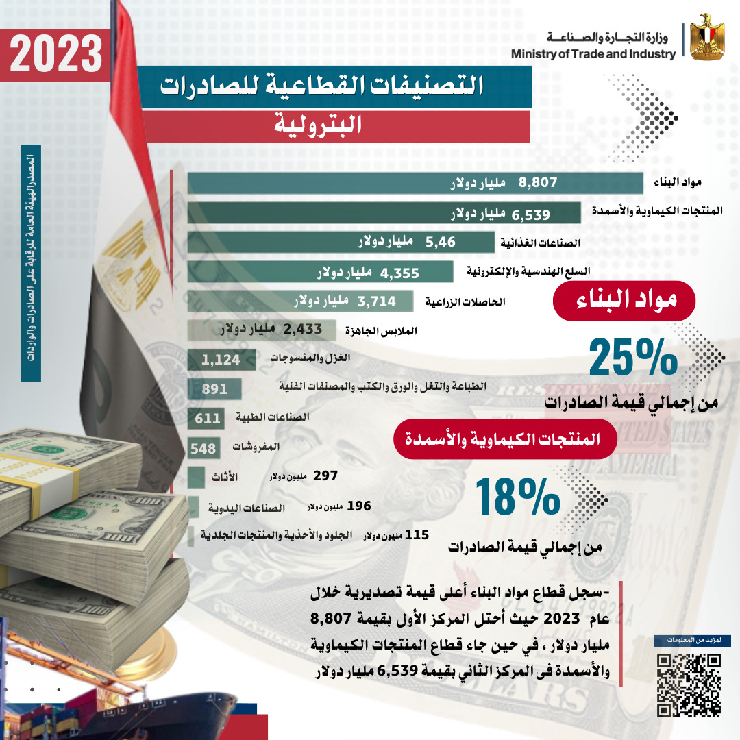 كما استعرض التقرير القطاعات التصديرية التي شكلت هيكل الصادرات المصرية خلال عام 2023 والتي تضمنت مواد البناء بقيمة 8 مليار و807 مليون دولار، والمنتجات الكيماوية والأسمدة بقيمة 6 مليار و539 مليون دولار، والصناعات الغذائية بقيمة 5 مليار و46 مليون دولار، والسلع الهندسية والإلكترونية بقيمة 4 مليار و355 مليون دولار، والحاصلات الزراعية بقيمة 3 مليار و714 مليون دولار، والملابس الجاهزة بقيمة 2 مليار و433 مليون دولار، والغزل والمنسوجات بقيمة مليار و124 مليون دولار، ومنتجات الطباعة والتغليف والورق والكتب والمصنفات الفنية بقيمة 891 مليون دولار، والصناعات الطبية بقيمة 611 مليون دولار، والمفروشات بقيمة 548 مليون دولار، والأثاث بقيمة 297 مليون دولار، والصناعات اليدوية بقيمة 196 مليون دولار، والجلود والأحذية والمنتجات الجلدية بقيمة 115 مليون دولار.