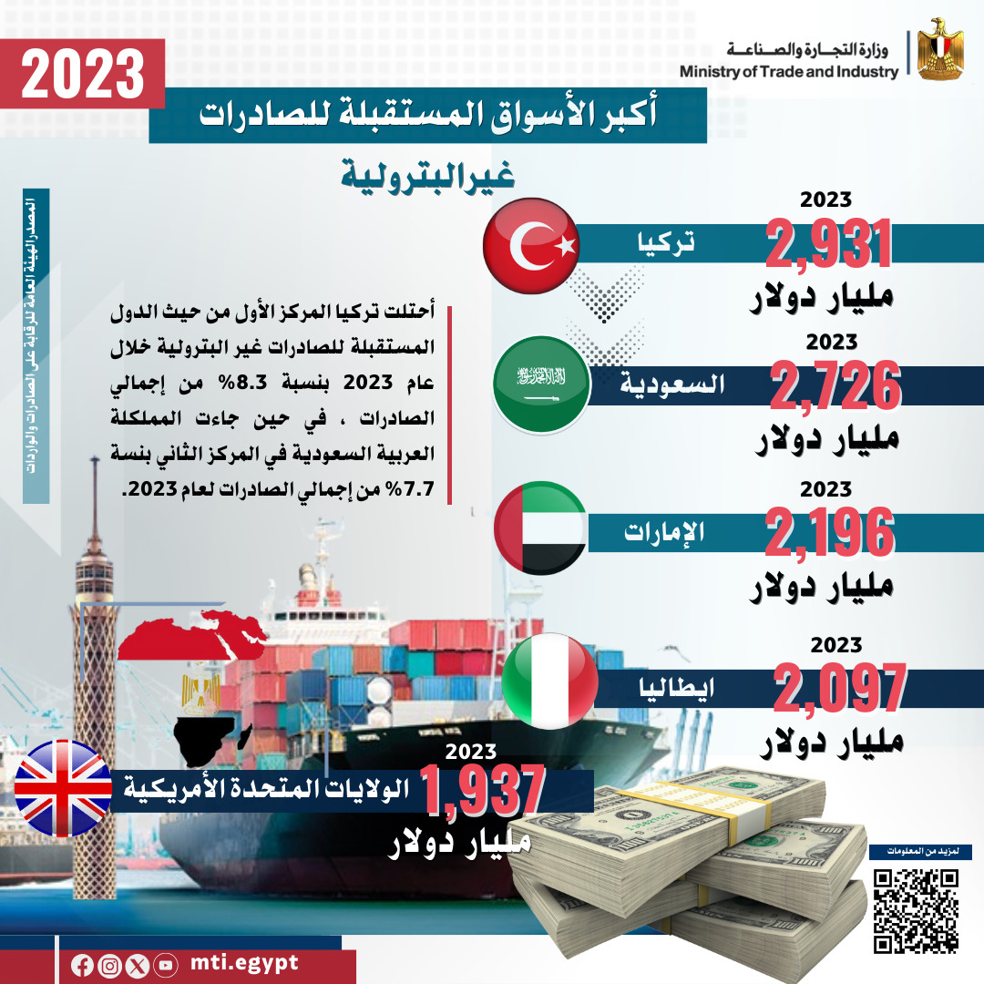 وتضمن التقرير أكبر الأسواق المستقبلة للصادرات المصرية خلال العام الماضي والتي شملت تركيا بقيمة 2 مليار و943 مليون دولار، والمملكة العربية السعودية بقيمة 2 مليار و766 مليون دولار، والامارات العربية المتحدة بقيمة 2 مليار و197 مليون دولار، وإيطاليا بقيمة 2 مليار و103 مليون دولار، والولايات المتحدة الامريكية بقيمة مليار و966 مليون دولار.