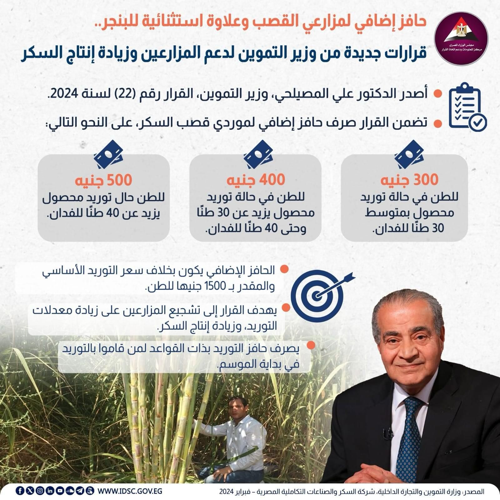 نشر مركز معلومات مجلس الوزراء إنفوجراف ، عن وزارة التموين، أوضح خلاله انه سعيًا من الحكومة المصرية لدعم المزارعين وزيادة إنتاج السكر، أصدر الدكتور علي المصيلحي وزير التموين، القرار رقم (22) لسنة 2024، والذى تضمن عدة قرارات، منها صرف حافز إضافي لموردي قصب السكر بقيمة تتراوح من 300 إلى 500 جنيه للطن، بالإضافة إلى السعر الأساسي للتوريد والبالغ 1500 جنيه للطن.