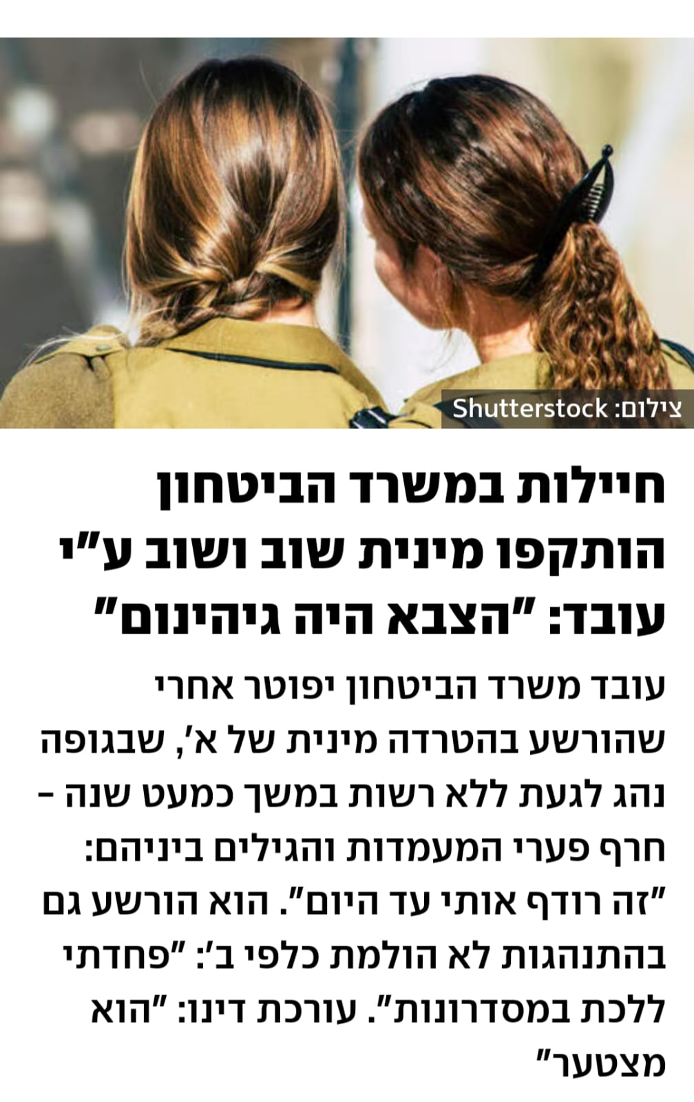 وفي تقرير لصحيفة يديعوت أحرنوت لمجندات في الجيش الاسرائيلي تعرضن لاعتداءات جنسية متكررة من قبل موظف، وقد وصفوا أن الجيش جحيما بالنسبة لهم ، وبحسب الدعوى ، فإن المجندات اللاتي تم الاعتداء عليهن قد اختارن خدمة عسكرية كبيرة في الجيش وشعرن بخيبة أمل عميقة لأنه كان من المفترض أن يكون الجيش مكانا آمانا بالنسبة لهم فلقد أصبح ساحة للتحرش الجنسي .