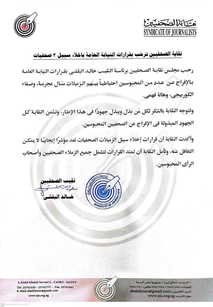 وأكدت النقابة أن قرارات إخلاء سبيل الزميلات الصحفيات تعدد مؤشرا إيجابيا لا يمكن