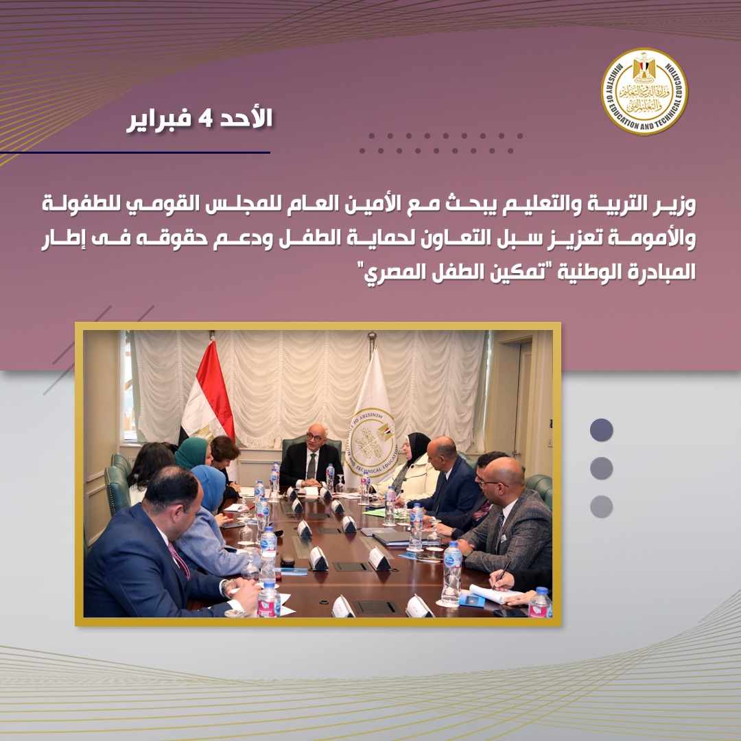 استقبل الدكتور رضا حجازى وزير التربية والتعليم والتعليم الفني، الدكتورة نيفين عثمان، الأمين العام للمجلس القومي للطفولة والأمومة لتعزيز سُبل التعاون ومناقشة آليات العمل المشترك فيما يتعلق ببرامج حماية الطفل ودعم حقوقه، وذلك فى إطار المبادرة الوطنية "تمكين الطفل المصري".