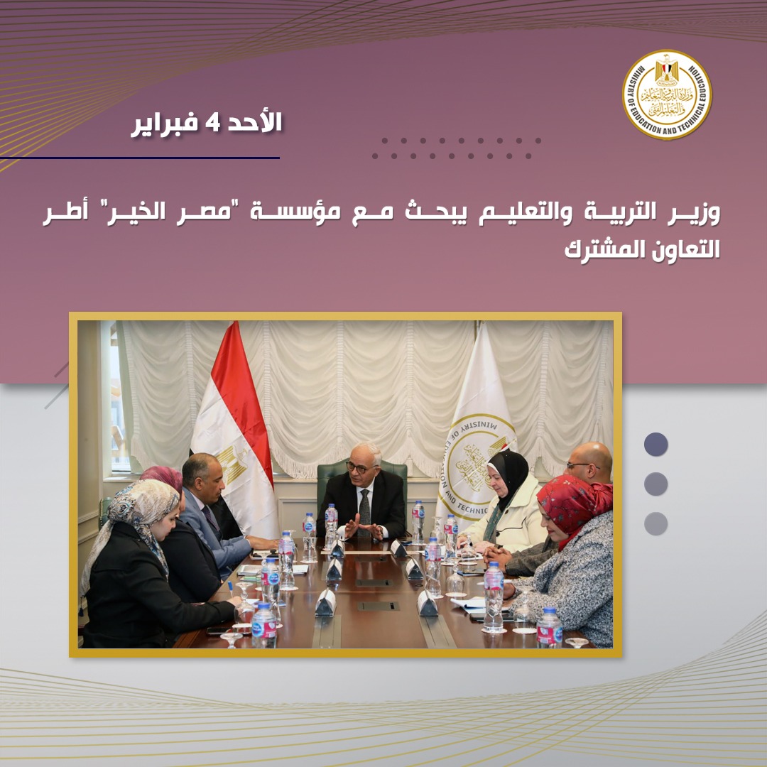 وقد تم خلال الاجتماع مناقشة مجالات التعاون بين وزارة التربية والتعليم، ومؤسسة "مصر الخير" والتى تضمنت تنفيذ برامج اكتشاف ورعاية الموهوبين بالمدارس، ودعم ورعاية الطلاب من ذوى الاحتياجات الخاصة، وتنمية المهارات الحياتية للطلاب من خلال الأنشطة التعليمية بالمدارس، كما تمت منافشة أطر التعاون فيما يتعلق بمدارس التعليم المجتمعي.