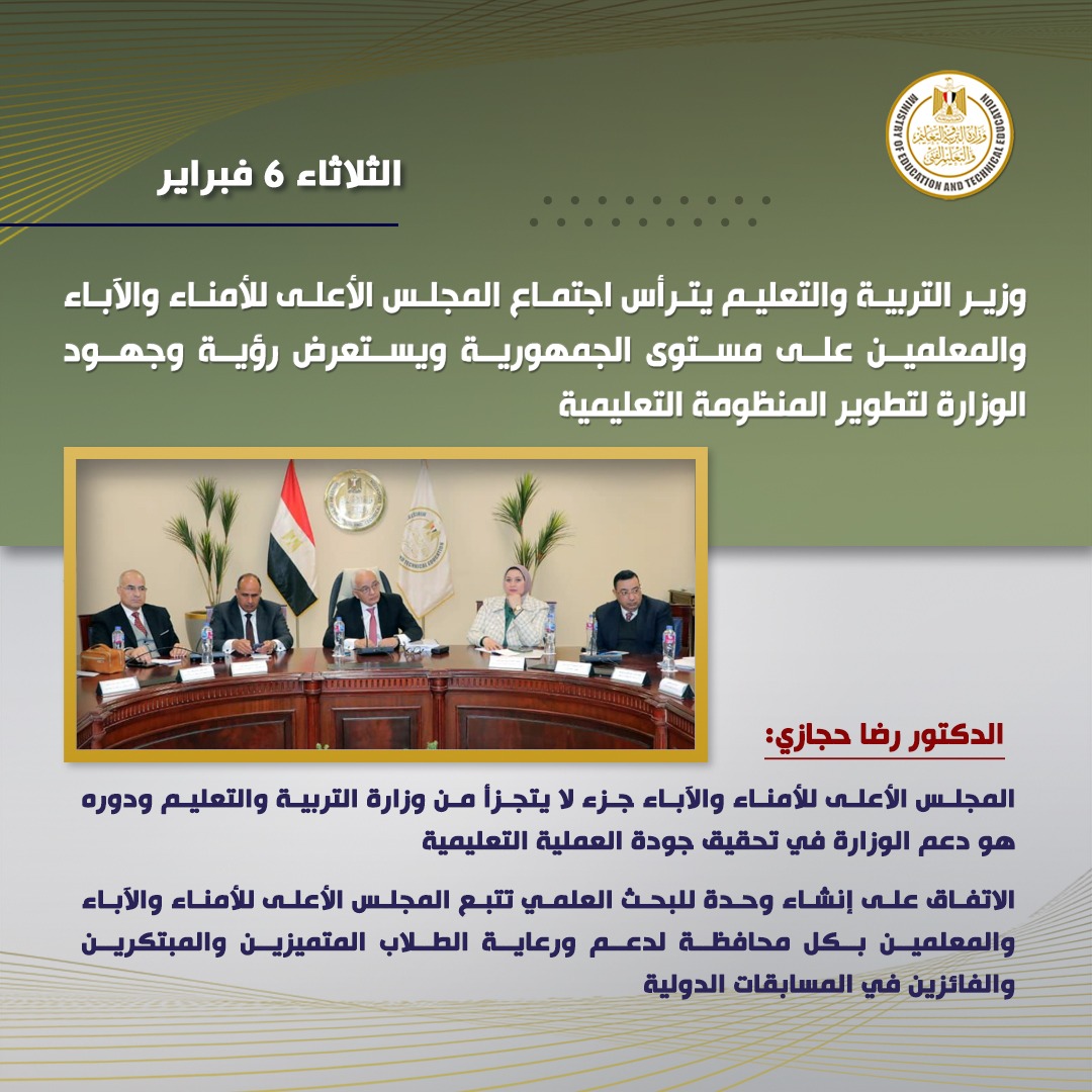 ترأس الدكتور رضا حجازي وزير التربية والتعليم والتعليم الفني، اجتماع المجلس الأعلى للأمناء والآباء والمعلمين على مستوى الجمهورية؛ لمناقشة عدد من المحاور المتعلقة بتطوير منظومة التعليم قبل الجامعي.