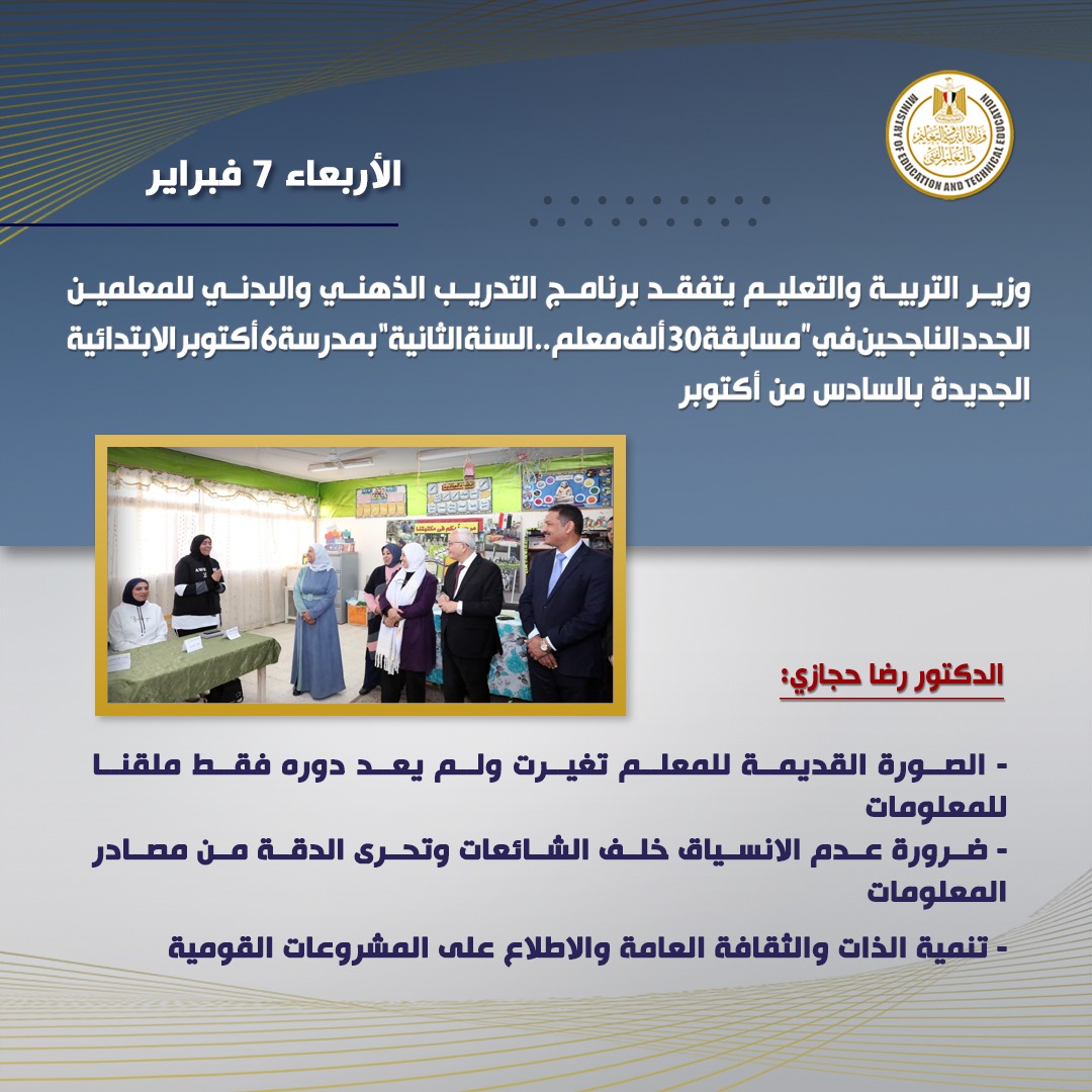 تفقد الدكتور رضا حجازى وزير التربية والتعليم والتعليم الفني، برنامج التدريب الذهني والبدني للمعلمين الجدد الناجحين فى "مسابقة 30 ألف معلم.. السنة الثانية”، وذلك بمدرسة 6 أكتوبر الابتدائية الجديدة بالسادس من أكتوبر.