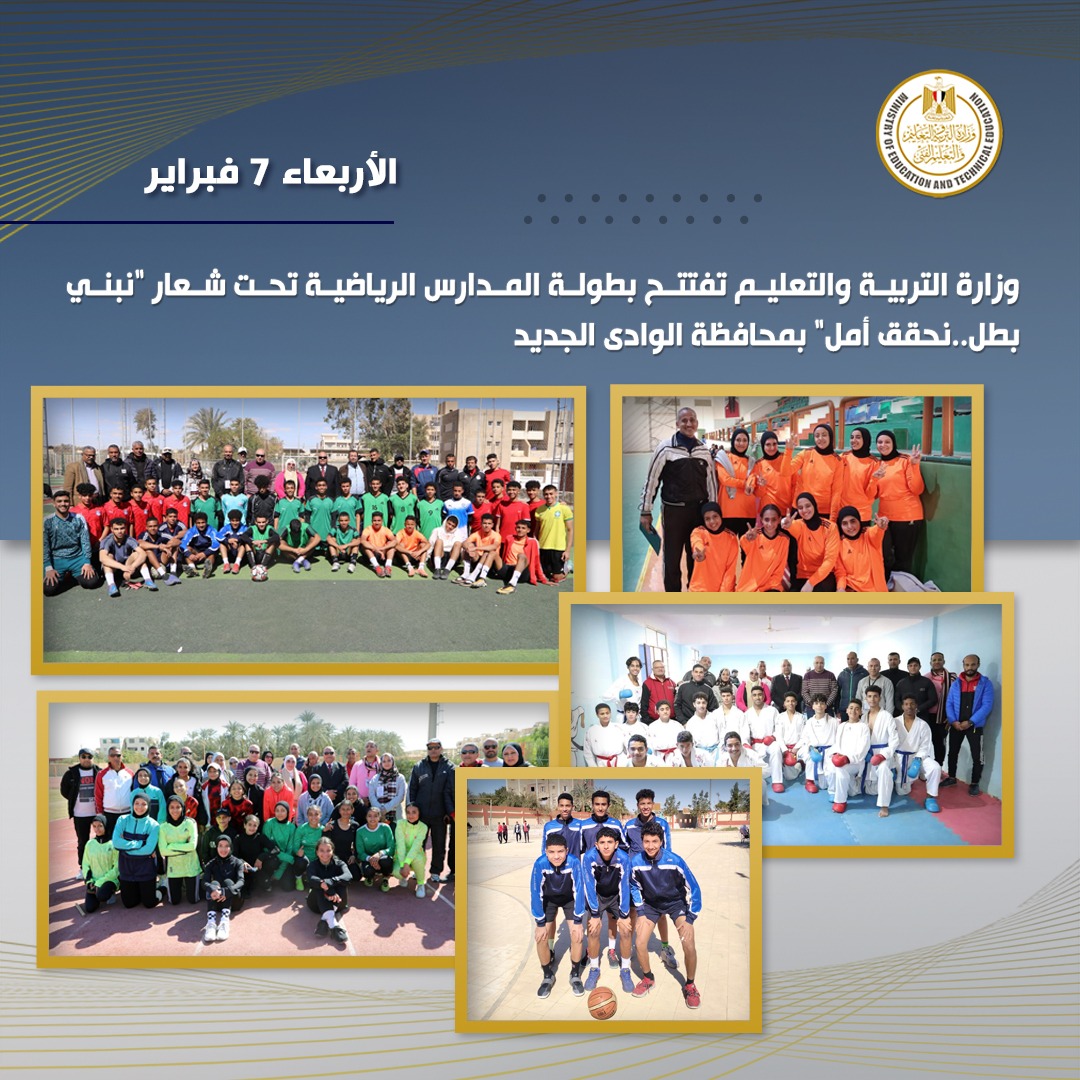 تحت رعاية الدكتور رضا حجازي وزير التربية والتعليم والتعليم الفني، والدكتور محمد الزملوط محافظ الوادى الجديد، أطلقت وزارة التربية والتعليم والتعليم الفني مسابقة بطولة المدارس الرياضية تحت شعار" نبني بطل ...نحقق أمل" في الفترة من 5 فبراير إلي 8 فبراير 2024 بمحافظة الوادي الجديد، وذلك تحت إشراف ومتابعة الدكتور أكرم حسن رئيس الإدارة المركزية لتطوير المناهج، والدكتورة منى يحيي مستشار الوزير لتنمية مادة التربية الرياضية والعسكرية.