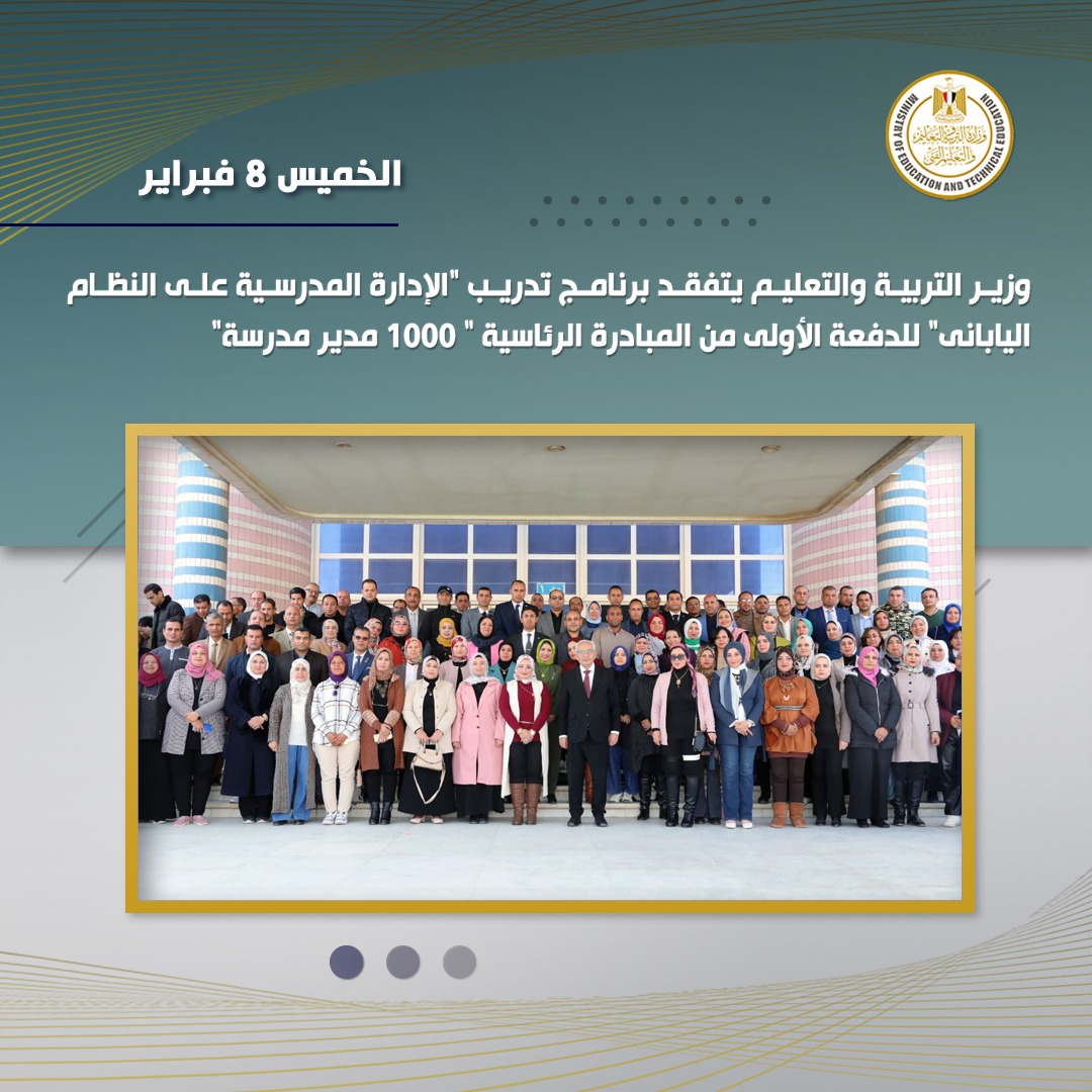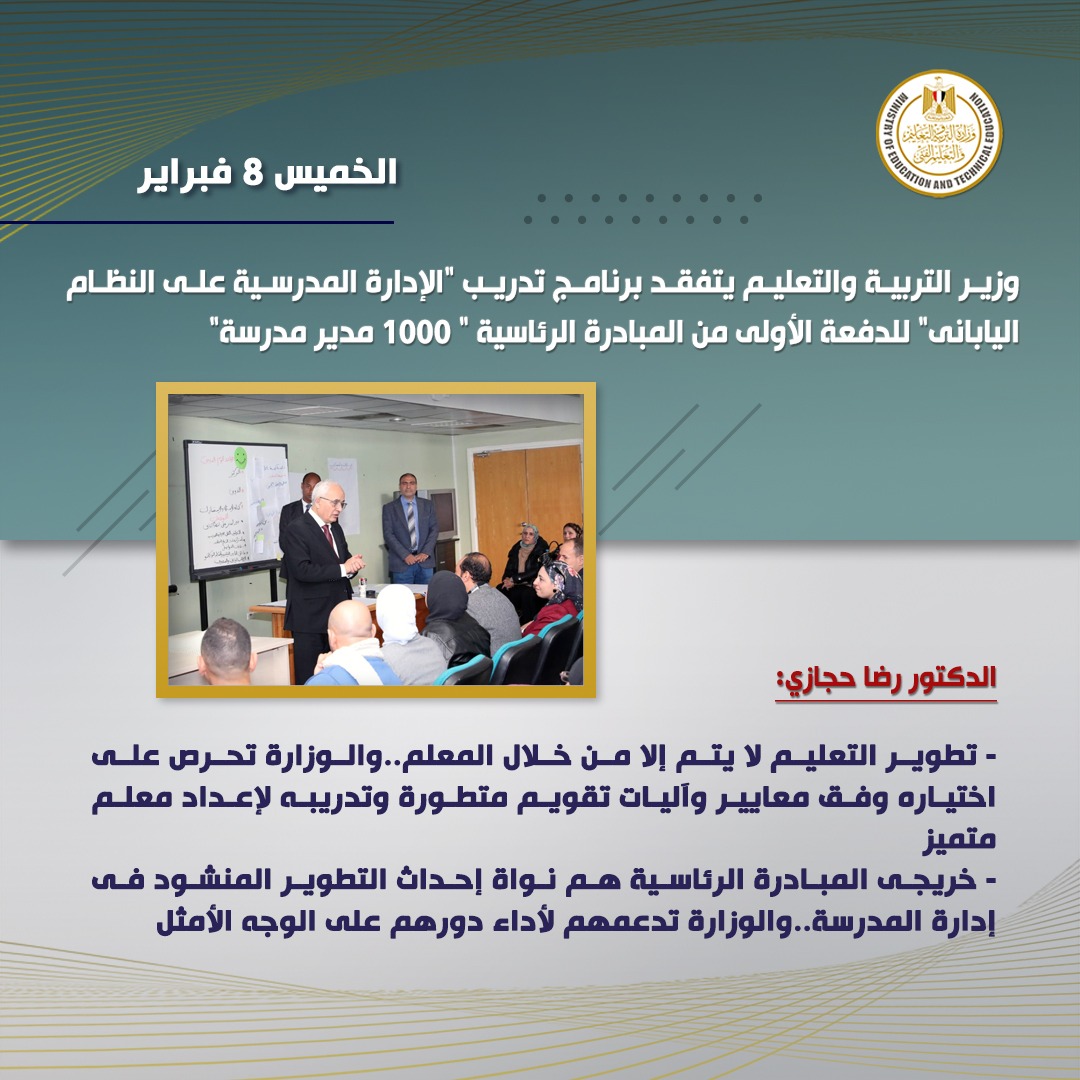 تفقد الدكتور رضا حجازى وزير التربية والتعليم والتعليم الفني، برنامج تدريب "الإدارة المدرسية على النظام اليابانى" للدفعة الأولى من المبادرة الرئاسية " 1000 مدير مدرسة"، والمقام خلال يومى 7 و8 فبراير 2024، وذلك بالمدينة التعليمية بالسادس من أكتوبر، والذى تنظمه الإدارة العامة للقيادات التربوية بالتنسيق مع وحدة المدارس المصرية اليابانية.