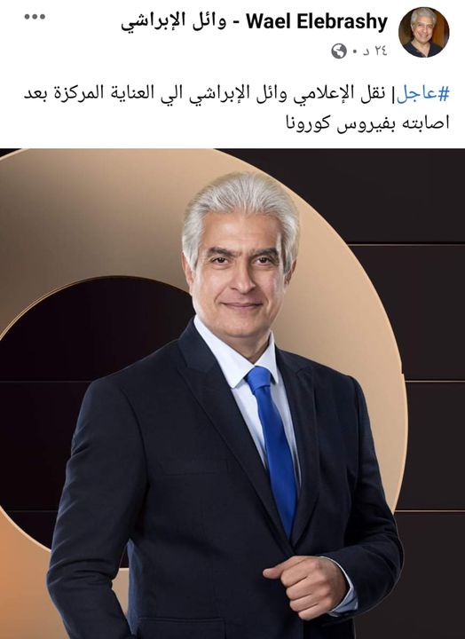 أعلنت صحفة الإعلامي وائل الإبراشي، على موقع التواصل الاجتماعي "فيسبوك"، اليوم الخميس، نقله إلى العناية المركزة، جراء إصابته بفيروس كورونا المستجد، الخميس الماضي.