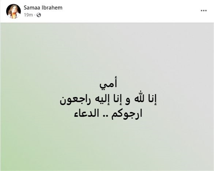 أعلنت الفنانة سماء إبراهيم وفاة والدتها، حيث كتبت سماء إبراهيم عبر حسابها على موقع التواصل الاجتماعي “فيس بوك”: "أمي إنا لله وإنا إليه راجعون، أرجوكم الدعاء".