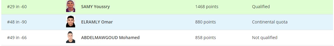 وشهد التصنيف الأولمبي لوزن 60 كجم تقدم يسري سامي لاعب منتخبنا الوطني ليحتل المركز الـ29، ليدخل ضمن كوتة التاهيل من التصنيف العالمي.