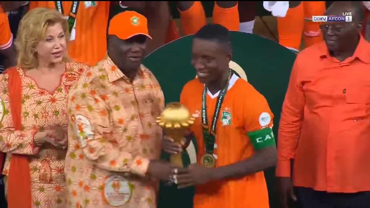 تسلم سيرجي أوريه قائد منتخب كوت ديفوار كأس بطولة أمم إفريقيا، ليرفعه عاليا أمام أنظار ألاف الإيفواريين الحاضرين في ملعب الحسن وأتارا.
