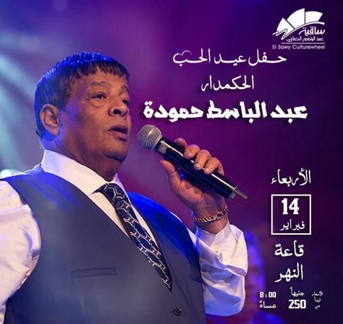 يستعد المطرب عبد الباسط حمودة لإحياء حفلًا غنائيًا مع جمهوره يوم عيد الحب الموافق 14 فبراير على مسرح ساقية الصاوي، ومن المقرر أن يقدم خلال الحفل باقة من أجمل أغانيه.