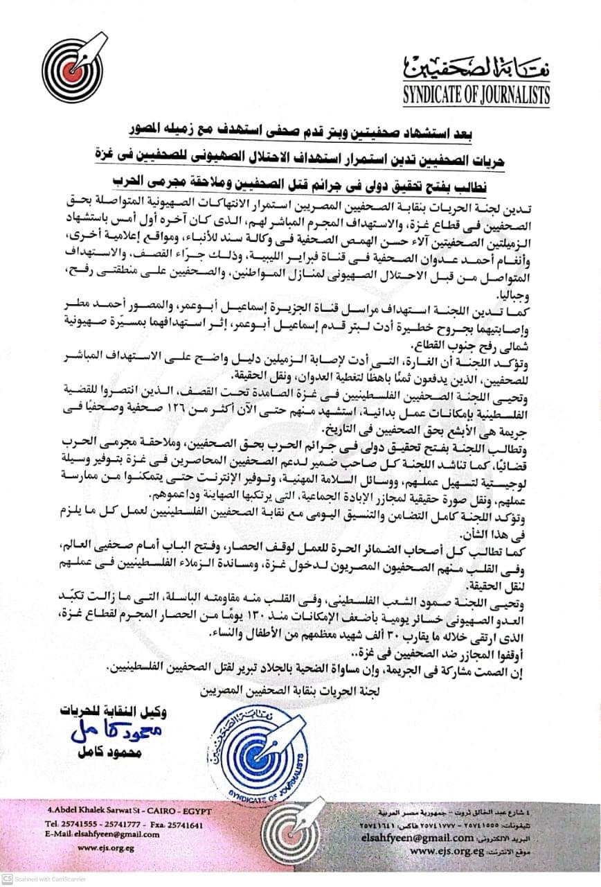 تدين لجنة الحريات بنقابة الصحفيين المصريين استمرار الانتهاكات الصهيونية المتواصلة بحق الصحفيين فى قطاع غزة، والاستهداف المجرم المباشر لهم، الذى كان آخره أول أمس باستشهاد الزميلتين الصحفيتين آلاء حسن الهمص الصحفية فى وكالة سند للأنباء، ومواقع إعلامية أخرى، وأنغام أحمد عدوان الصحفية فى قناة فبراير الليبية، وذلك جرّاء القصف، والاستهداف المتواصل من قبل الاحتلال الصهيونى لمنازل المواطنين، والصحفيين على منطقتى رفح، وجباليا.