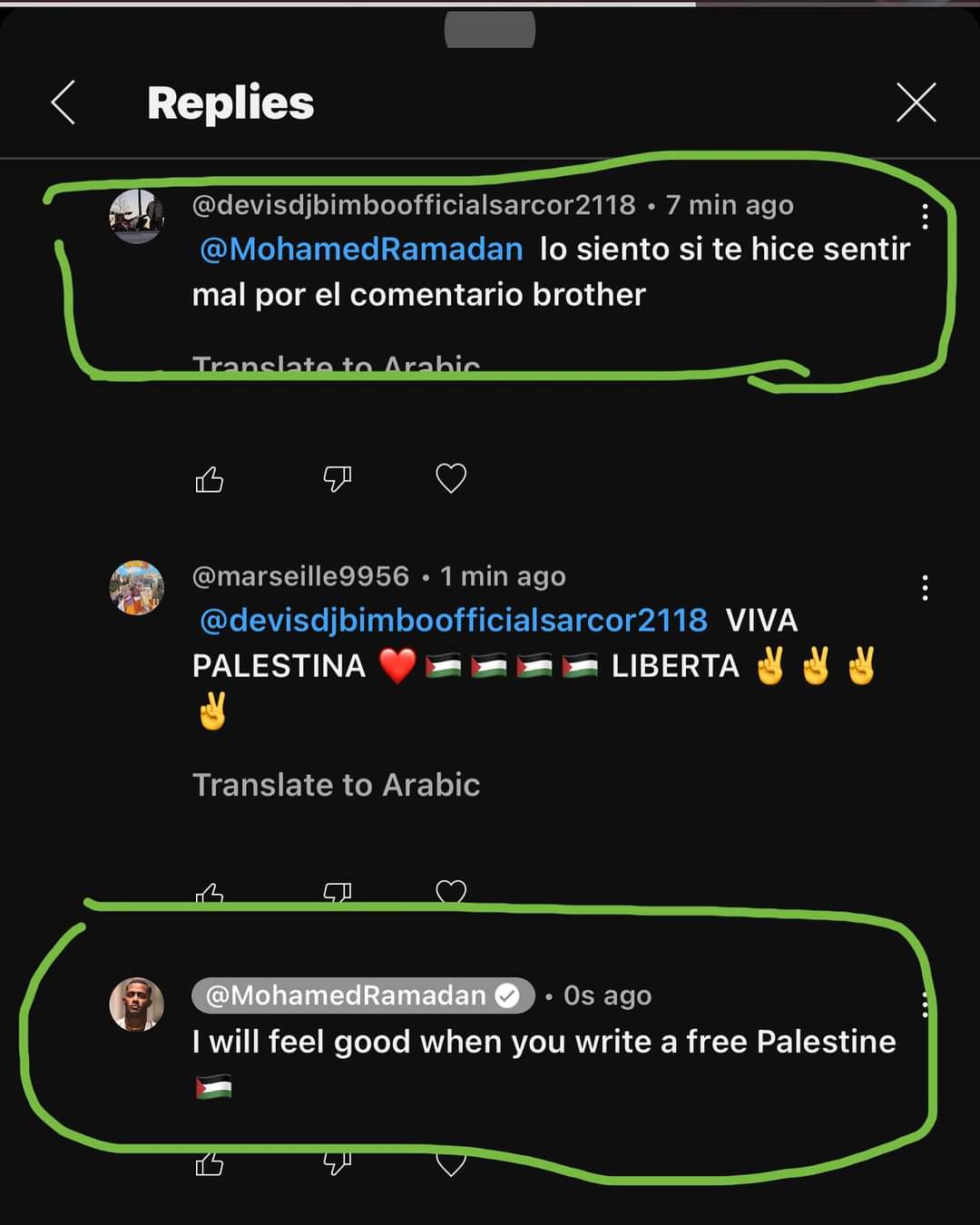 "لقد قدّمت تعليقك في الأعلى لأنني أريد أن أخبرك أن فلسطين حرّة"... الأمر الذي دفع الإسرائيلي لحذف تعليقه، ولكن محمد رمضان نشر عبر حسابه في "إنستغرام" صورة لهذا التعليق، مع القول: "وده طبعاً قبل ابن العم ما يمسح تعليقه… عربي والحمد لله".