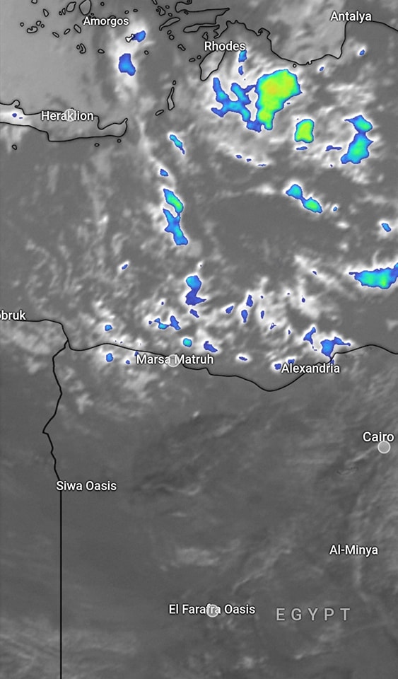 و الجدير بالذكر، تشهد السواحل الغربية زيادة في تكاثر السحب المتوسطة والمنخفضة، مصحوبة بهطول أمطار متفاوتة الشدة على مدار اليوم. يمتد تأثير هذه الحالة الجوية إلى مناطق من الوجه البحري ومدن القناة، وتكون حدة الأمطار أقل في هذه المناطق. وتمتد الفعالية الجوية أيضًا إلى شمال سيناء.