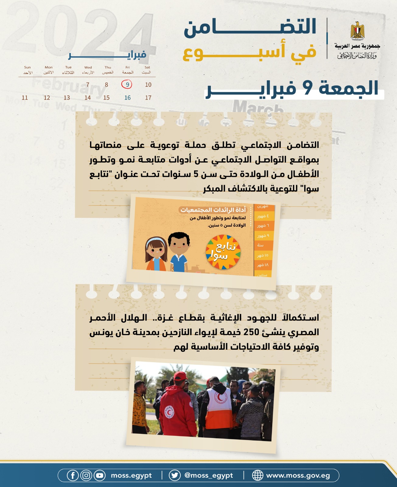 - التضامن الاجتماعي تطلق حملة توعوية على منصاتها بمواقع التواصل الاجتماعي عن أدوات متابعة نمو وتطور الأطفال من الولادة حتى سن ٥ سنوات تحت عنوان "نتابع سوا" للتوعية بالاكتشاف المبكر