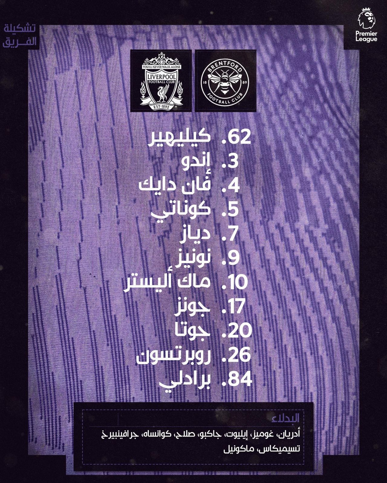 وجائت التشكيلة الرسمية لفريق ليفربول لمواجهة برينتفورد كالأتي:
