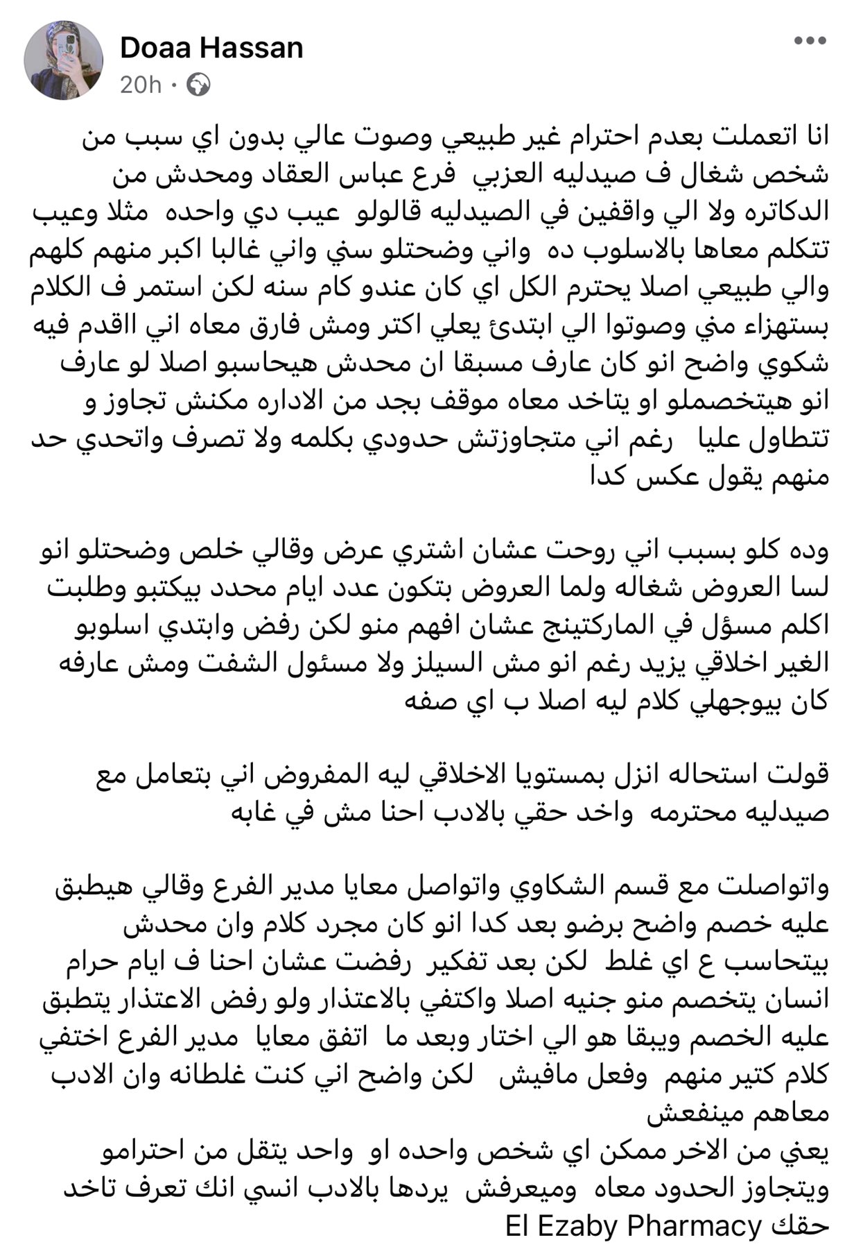 وقالت صاحبة الواقعة ، عبر السوشيال ميديا ،" انا اتعاملت بعدم احترام غير طبيعي وصوت عالي بدون اي سبب من شخص شغال ف صيدليه العزبي فرع عباس العقاد ومحدش من الدكاتره ولا الي واقفين في الصيدليه قالولو عيب دي واحده مثلا وعيب تتكلم معاها بالاسلوب ده واني وضحتلو سني واني غالبا اكبر منهم كلهم والي طبيعي اصلا يحترم الكل اي كان عندو كام سنه لكن استمر ف الكلام بستهزاء مني وصوتوا الي ابتدئ يعلي اكتر ومش فارق معاه اني أأقدم فيه شكوي".