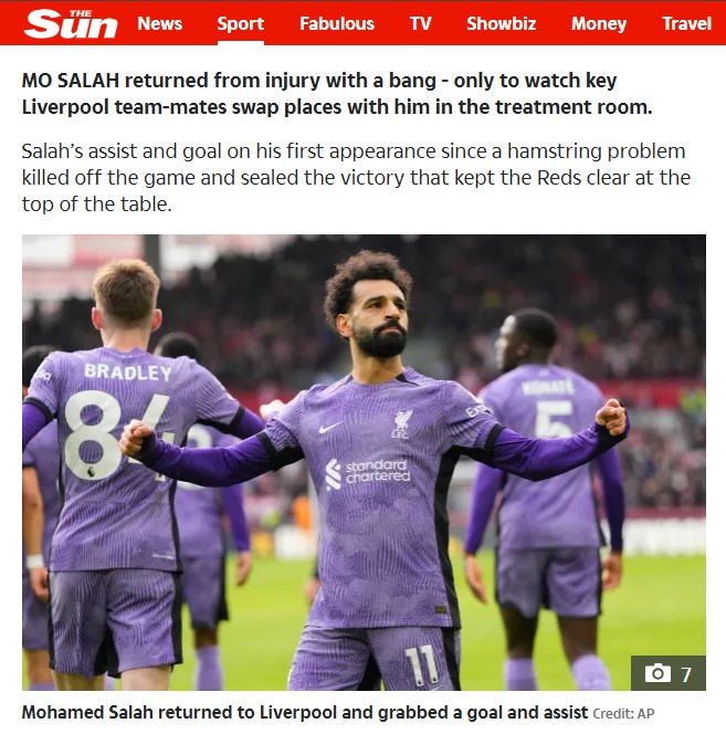 تغنت صحف إنجلترا بأداء الدولي المصري محمد صلاح بعد مباراة ليفربول أمام برينتفورد في الدوري الإنجليزي، والتي فاز بها الريدز برباعية نظيفة مقابل هدف، وساهم صلاح في هدفين في مسجلا هدفا وصانع أخر، لماك أليستر.