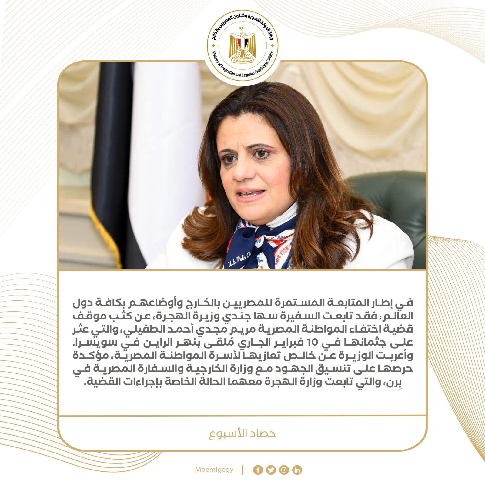 4- في إطار المتابعة المستمرة للمصريين بالخارج وأوضاعهم بكافة دول العالم، فقد تابعت السفيرة سها جندي وزيرة الهجرة، عن كثب موقف قضية اختفاء المواطنة المصرية مريم مجدي أحمد الطفيلي، والتي عثر على جثمانها في 10 فبراير الجاري مُلقى بنهر الراين في سويسرا. وأعربت الوزيرة عن خالص تعازيها لأسرة المواطنة المصرية، مؤكدة حرصها على تنسيق الجهود مع وزارة الخارجية والسفارة المصرية في بِرن، والتي تابعت وزارة الهجرة معهما الحالة الخاصة بإجراءات القضية.