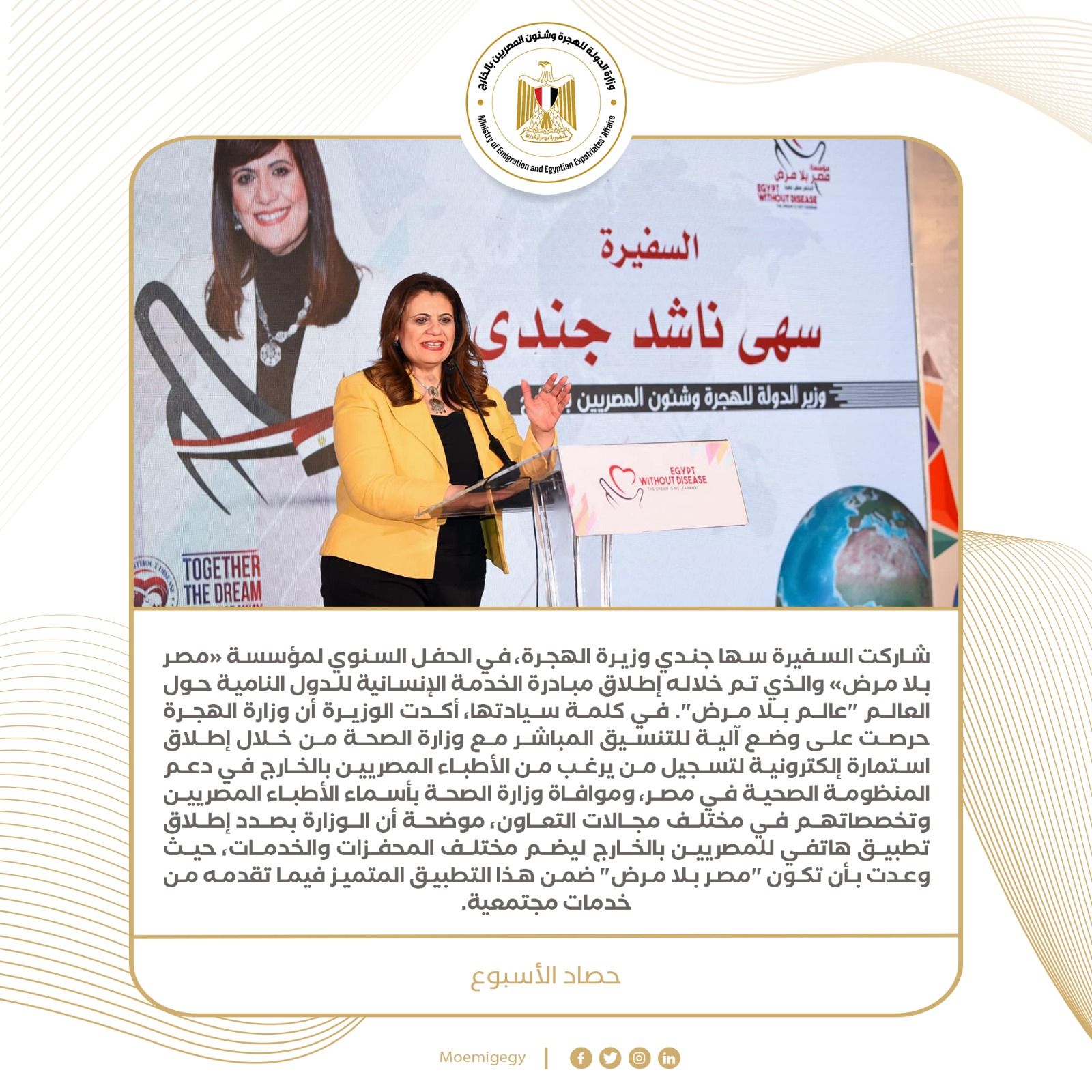3- شاركت السفيرة سها جندي وزيرة الهجرة، في الحفل السنوي لمؤسسة «مصر بلا مرض» والذي تم خلاله إطلاق مبادرة الخدمة الإنسانية للدول النامية حول العالم "عالم بلا مرض". في كلمة سيادتها، أكدت الوزيرة أن وزارة الهجرة حرصت على وضع آلية للتنسيق المباشر مع وزارة الصحة من خلال إطلاق استمارة إلكترونية لتسجيل من يرغب من الأطباء المصريين بالخارج في دعم المنظومة الصحية في مصر، وموافاة وزارة الصحة بأسماء الأطباء المصريين وتخصصاتهم في مختلف مجالات التعاون، موضحة أن الوزارة بصدد إطلاق تطبيق هاتفي للمصريين بالخارج ليضم مختلف المحفزات والخدمات، حيث وعدت بأن تكون "مصر بلا مرض" ضمن هذا التطبيق المتميز فيما تقدمه من خدمات مجتمعية.