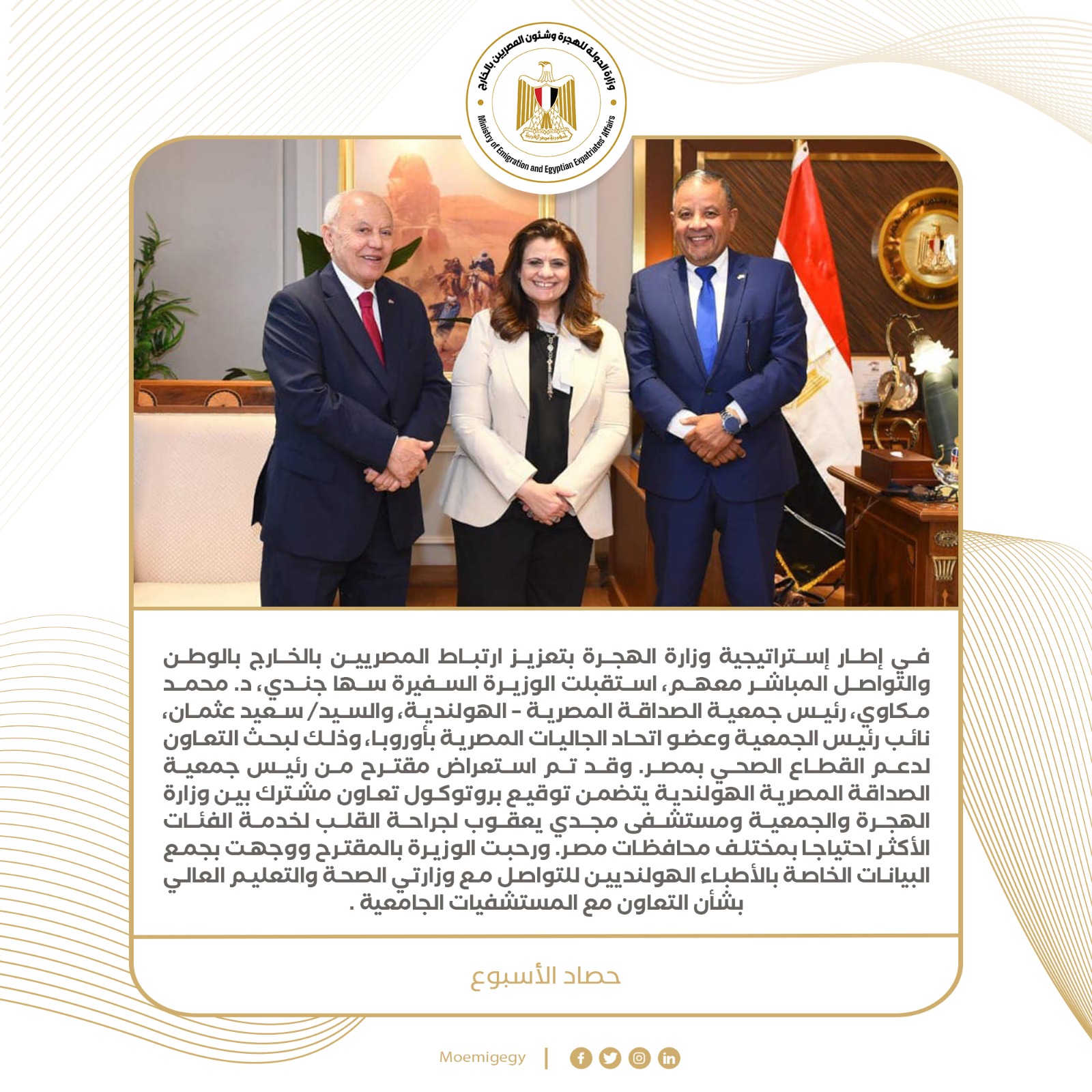 1- في إطار إستراتيجية وزارة الهجرة بتعزيز ارتباط المصريين بالخارج بالوطن والتواصل المباشر معهم، استقبلت الوزيرة السفيرة سها جندي، د. محمد مكاوي، رئيس جمعية الصداقة المصرية – الهولندية، وسعيد عثمان، نائب رئيس الجمعية وعضو اتحاد الجاليات المصرية بأوروبا، وذلك لبحث التعاون لدعم القطاع الصحي بمصر. وقد تم استعراض مقترح من رئيس جمعية الصداقة المصرية الهولندية يتضمن توقيع بروتوكول تعاون مشترك بين وزارة الهجرة والجمعية ومستشفى مجدي يعقوب لجراحة القلب لخدمة الفئات الأكثر احتياجا بمختلف محافظات مصر. ورحبت الوزيرة بالمقترح موجهة بجمع البيانات الخاصة بالأطباء الهولنديين للتواصل مع وزارتي الصحة والتعليم العالي بشأن التعاون مع المستشفيات الجامعية لاستخراج التصاريح اللازمة لهم، ووضع آلية للتعاون من أجل المساهمة في تقديم الخدمات الصحية المختلفة للفئات الأكثر احتياجًا.