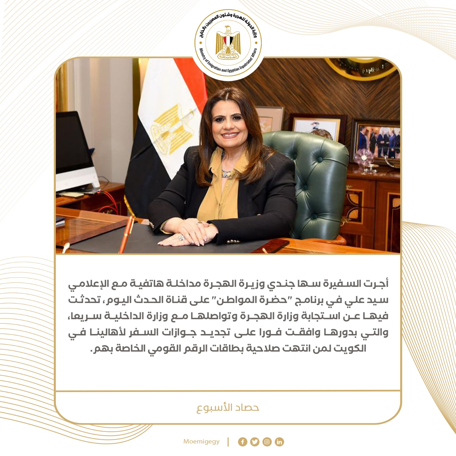 11- أجرت السفيرة سها جندي وزيرة الهجرة مداخلة هاتفية مع الإعلامي سيد علي في برنامج "حضرة المواطن" على قناة الحدث اليوم، تحدثت فيها عن استجابة وزارة الهجرة وتواصلها مع وزارة الداخلية سريعا، والتي بدورها وافقت فورا على تجديد جوازات السفر لأهالينا في الكويت لمن انتهت صلاحية بطاقات الرقم القومي الخاصة بهم.