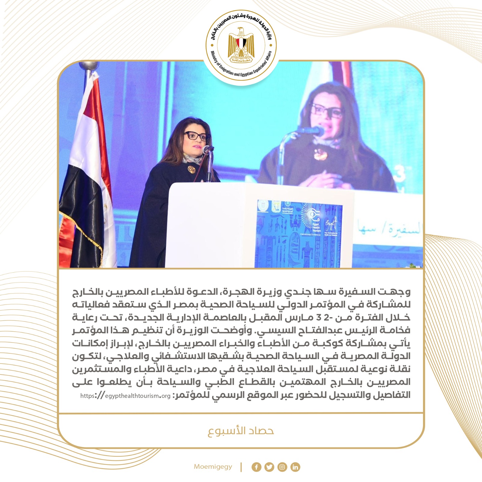 8- وجهت السفيرة سها جندي وزيرة الهجرة، الدعوة للأطباء المصريين بالخارج للمشاركة في المؤتمر الدولي للسياحة الصحية بمصر الذي ستعقد فعالياته خلال الفترة من 2- 3 مارس المقبل بالعاصمة الإدارية الجديدة، تحت رعاية فخامة الرئيس عبدالفتاح السيسي. وأوضحت الوزيرة أن تنظيم هذا المؤتمر يأتي بمشاركة كوكبة من الأطباء والخبراء المصريين بالخارج، لإبراز إمكانات الدولة المصرية في السياحة الصحية بشقيها الاستشفائي والعلاجي، لتكون نقلة نوعية لمستقبل السياحة العلاجية في مصر، داعية الأطباء والمستثمرين المصريين بالخارج المهتمين بالقطاع الطبي والسياحة بأن يطلعوا على التفاصيل والتسجيل للحضور عبر الموقع الرسمي للمؤتمر: https://egypthealthtourism.org