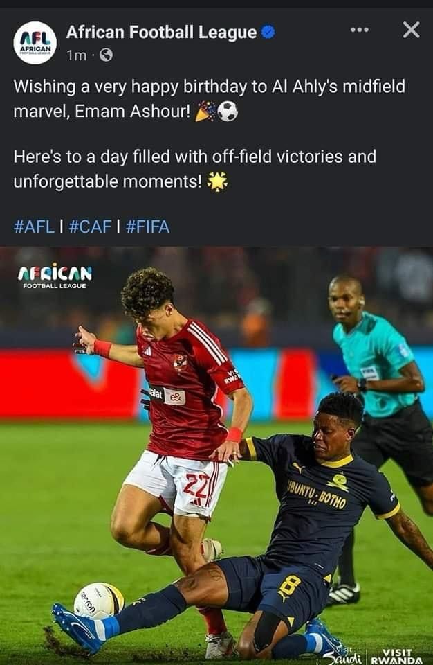 حساب الدوري الأفريقي يحتفل بعيد ميلاد إمام عاشور لاعب الأهلي عبر فيسبوك