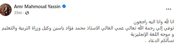 وكتب عبر حسابه الشخصي على موقع التواصل الاجتماعي “فيسبوك” منذ قليل: "إنا لله وإنا إليه راجعون، توفى إلى رحمة الله تعالى عمى الغالي الأستاذ محمد فؤاد ياسين وكيل وزارة التربية والتعليم وموجه اللغة الإنجليزية نسألكم الدعاء".