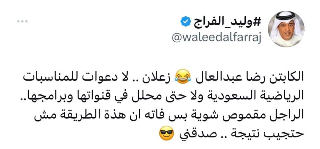 ونشر الفراج على صفحته بموقع التواصل الإجتماعي "إكس": "الكابتن رضا عبدالعال زعلان، لا دعوات للمناسبات الرياضية السعودية ولا حتى محلل في قنواتها وبرامجها، الراجل مقموص شوية بس فاته ان هذة الطريقة مش حتجيب نتيجة "صدقني".