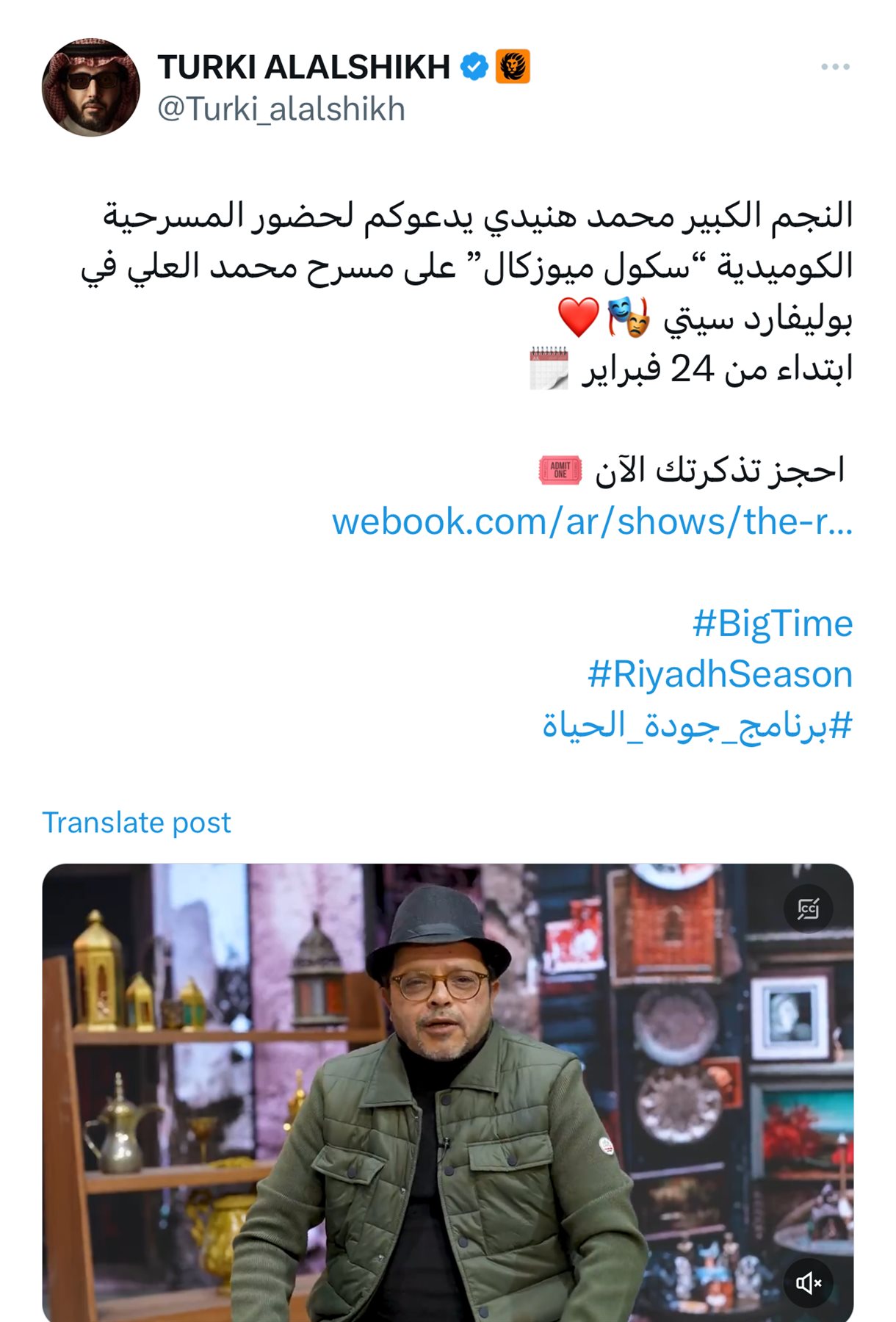 ورغم انتشار هذه الصورة إلا أن الإعلان الأصلى الذى نشره المستشار تركى آل الشيخ ، رئيس هيئة الترفية السعودية لم يكن به كلمة الفنان السعودى، وعلق رئيس هيئة الترفية على إعلان مسرحية “ رمضان ميوزيكال سكول"، قائلا ،" النجم الكبير محمد هنيدي يدعوكم لحضور المسرحية الكوميدية “سكول ميوزكال” على مسرح محمد العلي في بوليفارد سيتي".