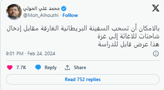 ومنشور الحوثي يشير إلى أن جماعته ستمنع أي محاولات لسحب السفينة، إلا إذا تم تنفيذ شرط إدخال المساعدات إلى غزة.