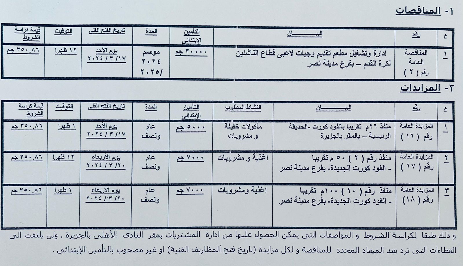 النادي الأهلي يعلن عن طرح تأجير منافذ وإدارة وتشغيل مطعم في مزايدات عامة ومناقصة عامة للعام المالي 2023ـ2024 وذلك بنظام المظروفين (فني+مالي) طبقَا لكراسة الشروط والمواصفات التي يمكن الحصول عليها من إدارة المشتريات بمقر النادي الأهلي بالجزيرة.