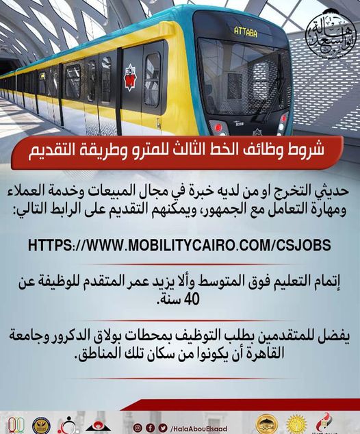 أعلنت الشركة المشغلة للخط الثالث للمترو والقطار الكهربائي الخفيف ، عن فتح أبوابها للراغبين في العمل وطرح وظائف بوظيفة بيع التذاكر بالمحطات في مناطق بولاق الدكرور، جامعة القاهرة، التوفيقية، وادي النيل، جامعة الدول للعمل بقسم خدمة العملاء بالخط الأخضر الثالث للمترو.