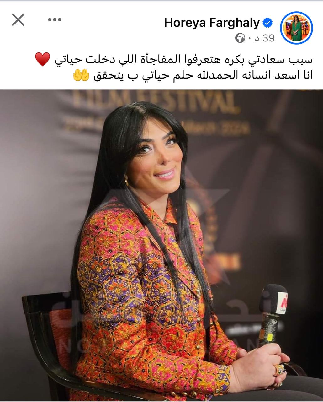 وكتبت حورية فرغلي عبر حسابها الشخصي فيس بوك: "سبب سعادتي بكره.. هتعرفوا المفاجأة اللي دخلت حياتي، أنا أسعد إنسانة الحمد لله حلم حياتي بيتحقق"، دون الكشف عن تفاصيل المفأجاة.