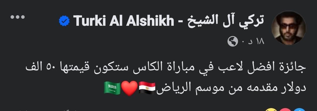 وكتب تركي آل الشيخ عبر صفحته الشخصية على "فيسبوك": "عمق العلاقه بين المملكه العربيه السعوديه وجمهورية مصر الشقيقه ولمحبتنا وتقديرنا ل اهلنا في مصر الغاليه ... ولحماسنا لمباراة الكاس ولتاريخ الاهلي والزمالك ... موسم الرياض يقدم جائزه اضافيه للفريق الفائز قدرها ٥٠٠ الف دولار ... واليوم طرح التذاكر استعدو".