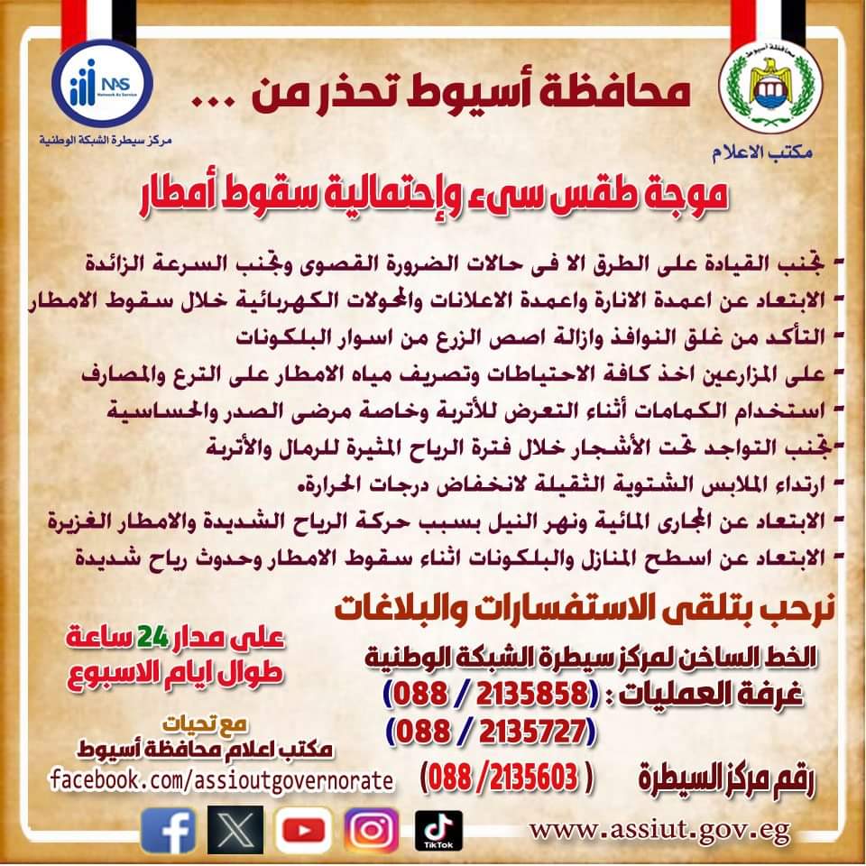 وناشد محافظ أسيوط جموع المواطنين بأخذ الحيطة والحذر والالتزام خاصة قائدي السيارات على الطرق السريعة أثناء القيادة على الطرق السريعة والصحراوية والالتزام بالسرعات المقررة وبتعليمات المرور وهيئة الأرصاد الجوية واتباع التعليمات المرورية الخاصة في حالة هبوب عواصف ترابية اوسقوط أمطار وتجنب الإقتراب من أعمدة الكهرباء أو السير تحت الأسلاك وعدم الوقوف بجانب الأشجار أو اللوحات الإعلانية في حال حدوث موجات هواء شديدة وعدم الوقوف في الأماكن المكشوفة في حال حدوث البرق معلنًا عن إستقبال شكاوى المواطنين أو الإبلاغ عن أية طارىء من خلال رقم الخط الساخن على أرقام (2135858/ 088) أو رقم (2135727/ 088) أو رقم (2135474/ 088) أو إرسال الصور والشكاوى عن طريق برنامج تليجرام رقم (01000623873) بالإضافة إلى رقم منظومة الشكاوى الحكومية الموحدة (16528) التابع لمجلس الوزراء أو من خلال البوابة الإلكترونية للمنظومة www.shakwa.eg.