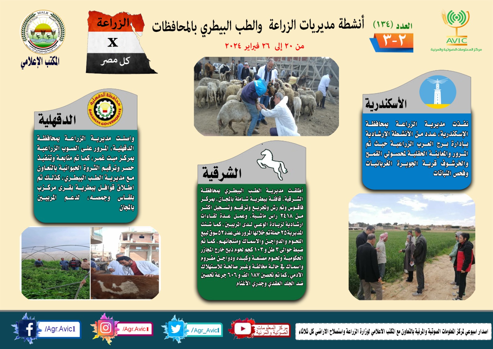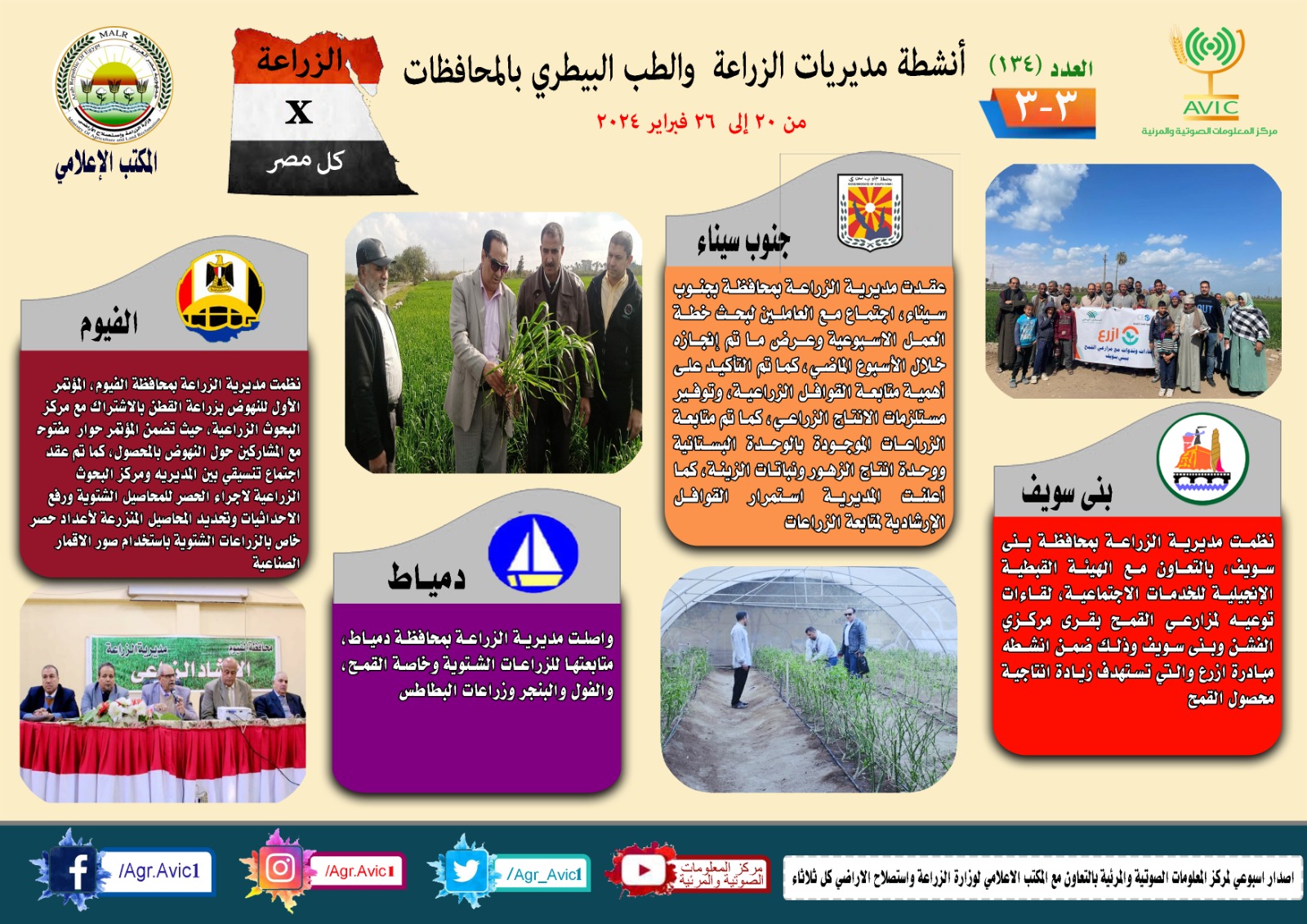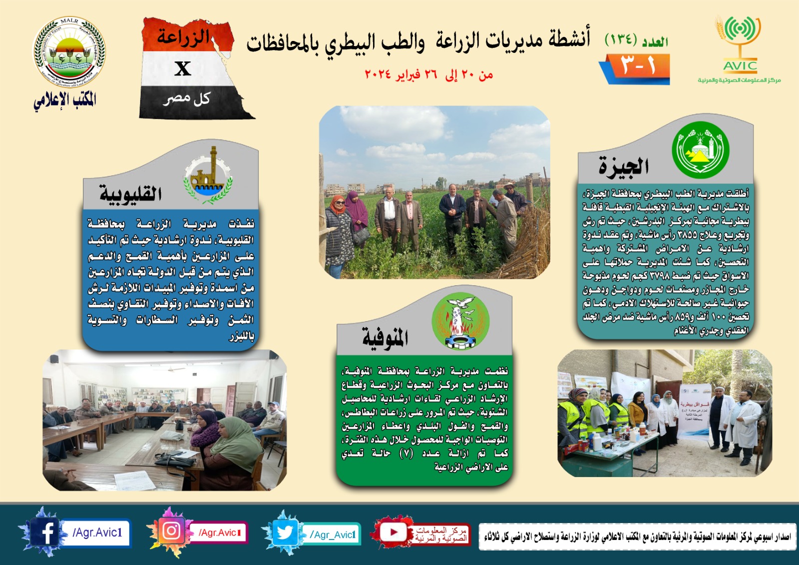 أصدر مركز المعلومات الصوتية والمرئية التابع لوزارة الزراعة واستصلاح الأراضي، والمكتب الاعلامي للوزارة، العدد رقم 134 من اصدار: "الزراعة في كل مصر" بالانفوجراف والفيديو، يوضح الجهود والانشطة التي تقوم بها مديريات الزراعة والطب البيطري بمحافظات الجمهورية خلال الفترة من 20 وحتى 26 فبراير الجاري.