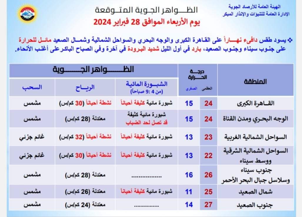 وقالت الأرصاد إن هناك شبورة مائية كثيفة تصل إلى حد الضباب، تتركز على الطرق المؤدية إلى القاهرة والوجه البحري والسواحل الشمالية الغربية والشرقية، ومن وإلى الطرق المؤدية من وإلى المسطحات المائية.