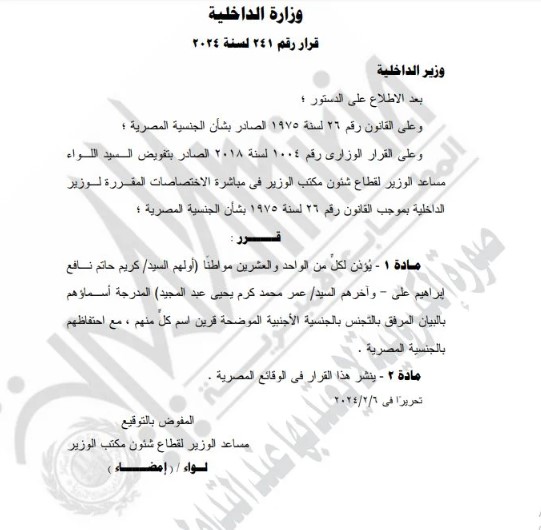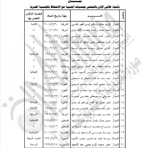 نشرت الجريدة الرسمية اليوم الأربعاء قرار وزارة الداخلية بالإذن لـ63 مواطن بالتجنس بجنسيات أجنبية، مرفقة مقابل كل اسم في الكشوف التالية مع الاحتفاظ ب الجنسية المصرية .