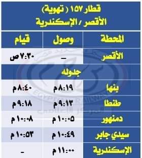 - تعديل ميعاد قيام قطار 2026 تالجو الإسكندرية - القاهرة ليقوم من محطة الإسكندرية الساعة 7:45 مساءاً بدلاً من الساعة 6:50 مساءاً ليصل محطة القاهرة الساعة 10:15 مساءاً طبقاً للجدول المرفق .