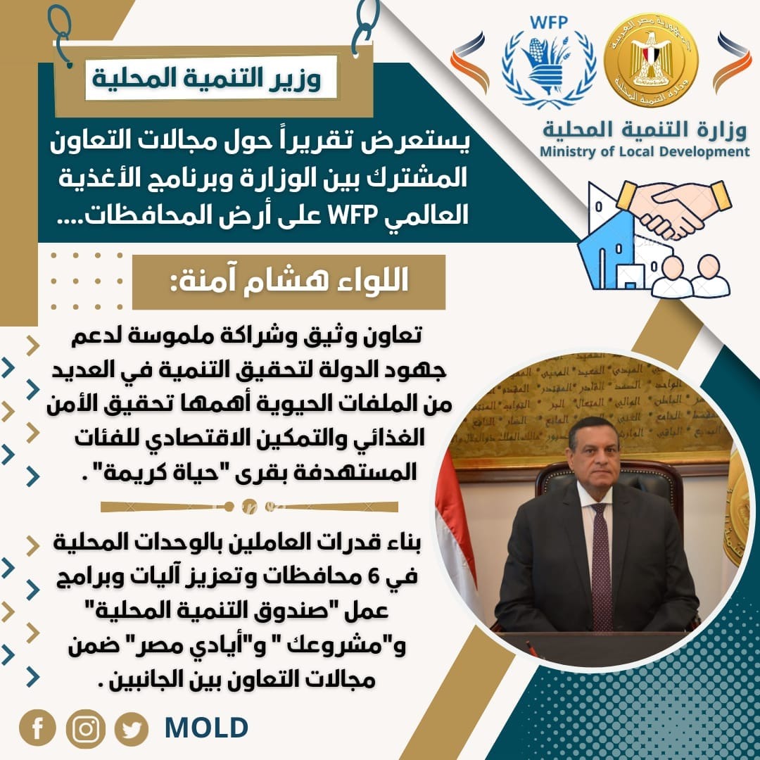 تلقى اللواء هشام آمنة وزير التنمية المحلية، تقريراً حول مجالات وبرامج التعاون المشترك بين الوزارة وبرنامج الأغذية العالمي (WFP) على أرض المحافظات خلال الفترة الماضية وذلك وفقاً لاتفاقية التعاون الموقعة بين الجانبين.