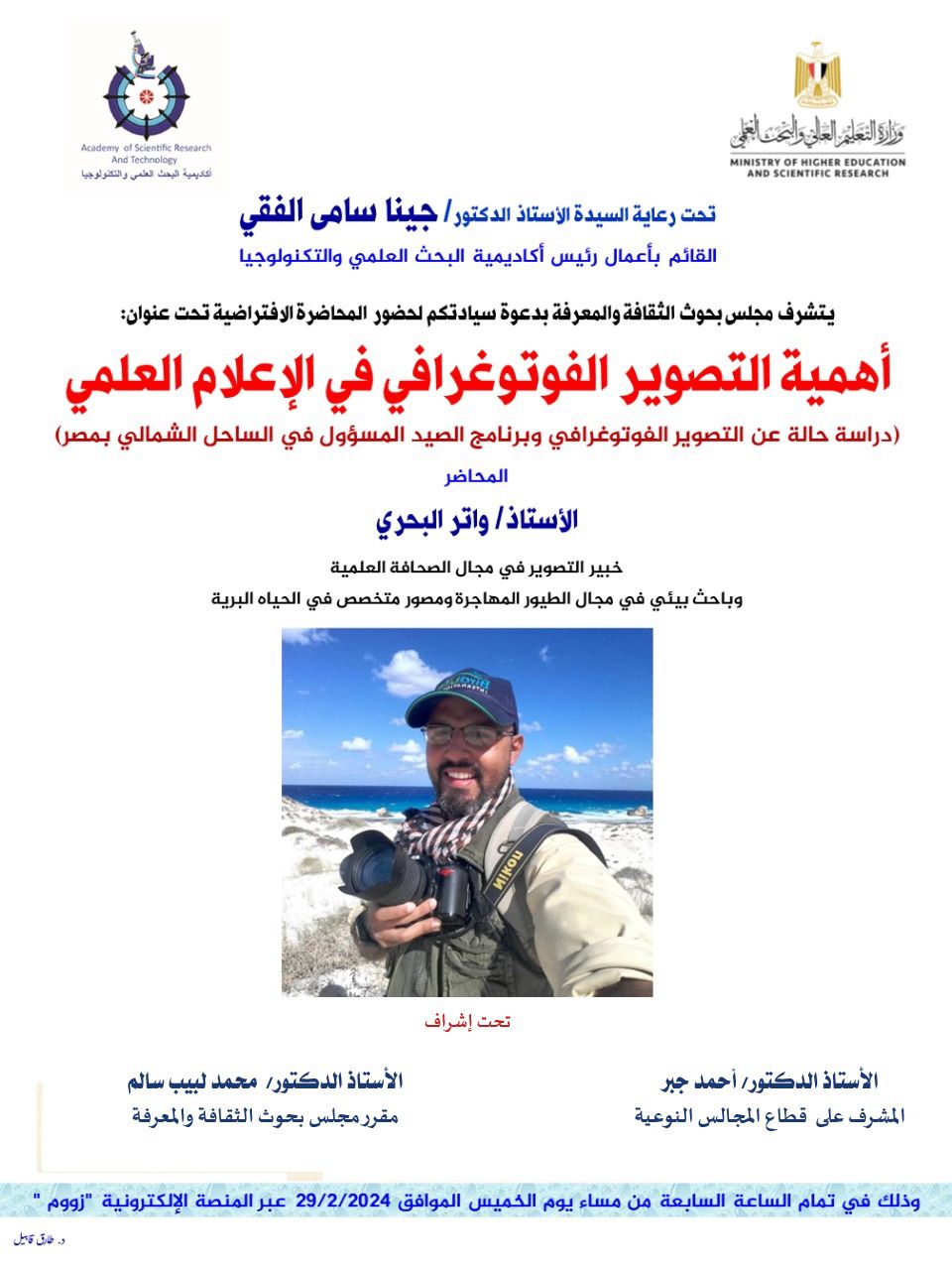 عقد مجلس بحوث الثقافة والمعرفة بأكاديمية البحث العلمي والتكنولوجيا ندوة تثقيفية أون لأين لشهر فبراير 2024 تحت عنوان: “أهمية التصوير الفوتوغرافى فى الإعلام العلمى (دراسة حالة عن التصوير الفوتوغرافى وبرنامج الصيد المسئول فى الساحل الشمالى بمصر” ألقاها واتر البحرى خبير التصوير فى مجال الصحافة العلمية وباحث بيئى فى مجال الطيور المهاجرة ومصور متخصص فى الحياة البرية وذلك تحت رعاية أ.د.جينا الفقى القائم بأعمال رئيس أكاديمية البحث العلمي والتكنولوجيا وأ.د. أحمد جبر المشرف على المجالس النوعية وإشراف أ.د.محمد لبيب سالم مقرر مجلس بحوث الثقافة والمعرفة وادارت الجلسة الأستاذة الدكتورة دينا فاروق أبوزيد أستاذ الإعلام بجامعة عين شمس وعضو المجلس وذلك عبر المنصة الافتراضية زووم لأكاديمية البحث العلمي والتكنولوجيا.