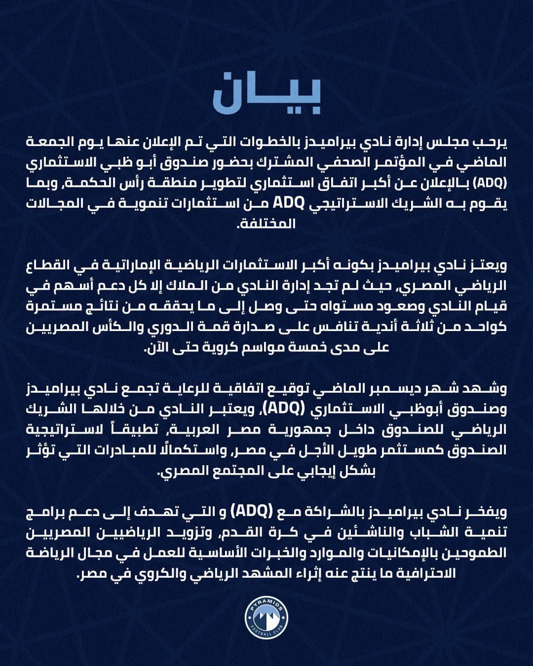 أصدر مجلس إدارة نادي بيراميدز بيانا يرحب فيه بالخطوات التي تم الإعلان عنها يوم الجمعة الماضي في المؤتمر الصحفي المشترك بحضور صندوق أبو ظبي الاستثماري (ADQ) بالإعلان عن أكبر اتفاق استثماري لتطوير منطقة رأس الحكمة، وبما يقوم به الشريك الاستراتيجي ADQ من استثمارات تنموية في المجالات المختلفة.