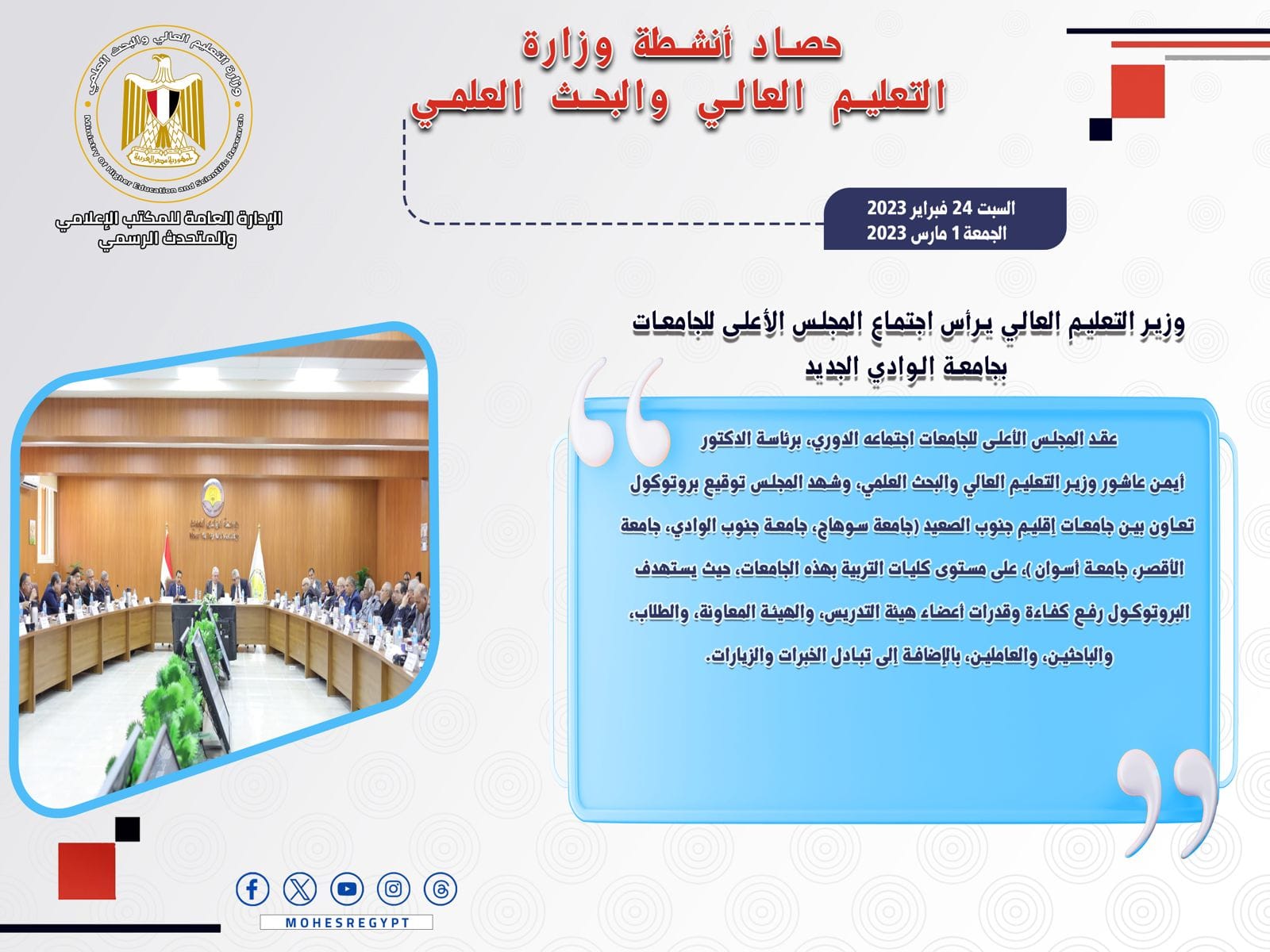 1) عقد المجلس الأعلى للجامعات اجتماعه الدوري، برئاسة الدكتور أيمن عاشور وزير التعليم العالي والبحث العلمي، وشهد المجلس توقيع بروتوكول تعاون بين جامعات إقليم جنوب الصعيد (جامعة سوهاج، جامعة جنوب الوادي، جامعة الأقصر، جامعة أسوان)، على مستوى كليات التربية بهذه الجامعات، حيث يستهدف البروتوكول رفع كفاءة وقدرات أعضاء هيئة التدريس، والهيئة المعاونة، والطلاب، والباحثين، والعاملين، بالإضافة إلى تبادل الخبرات والزيارات.