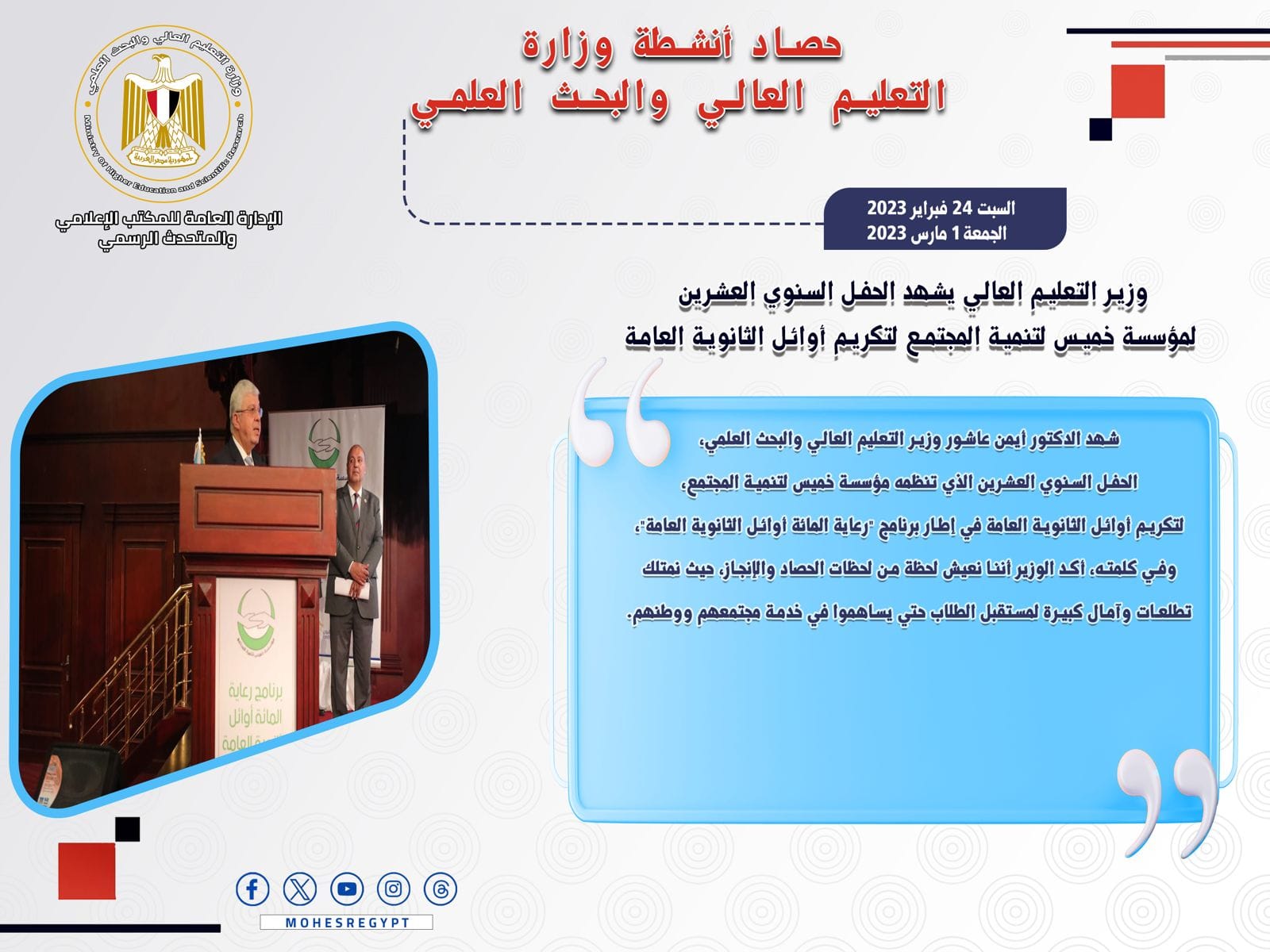 10) شهد الدكتور أيمن عاشور وزير التعليم العالي والبحث العلمي، الحفل السنوي العشرين الذي تنظمه مؤسسة خميس لتنمية المجتمع، لتكريم أوائل الثانوية العامة في إطار برنامج "رعاية المائة أوائل الثانوية العامة"، وفي كلمته، أكد الوزير أننا نعيش لحظة من لحظات الحصاد والإنجاز، حيث نمتلك تطلعات وآمال كبيرة لمستقبل الطلاب حتي يساهموا في خدمة مجتمعهم ووطنهم.