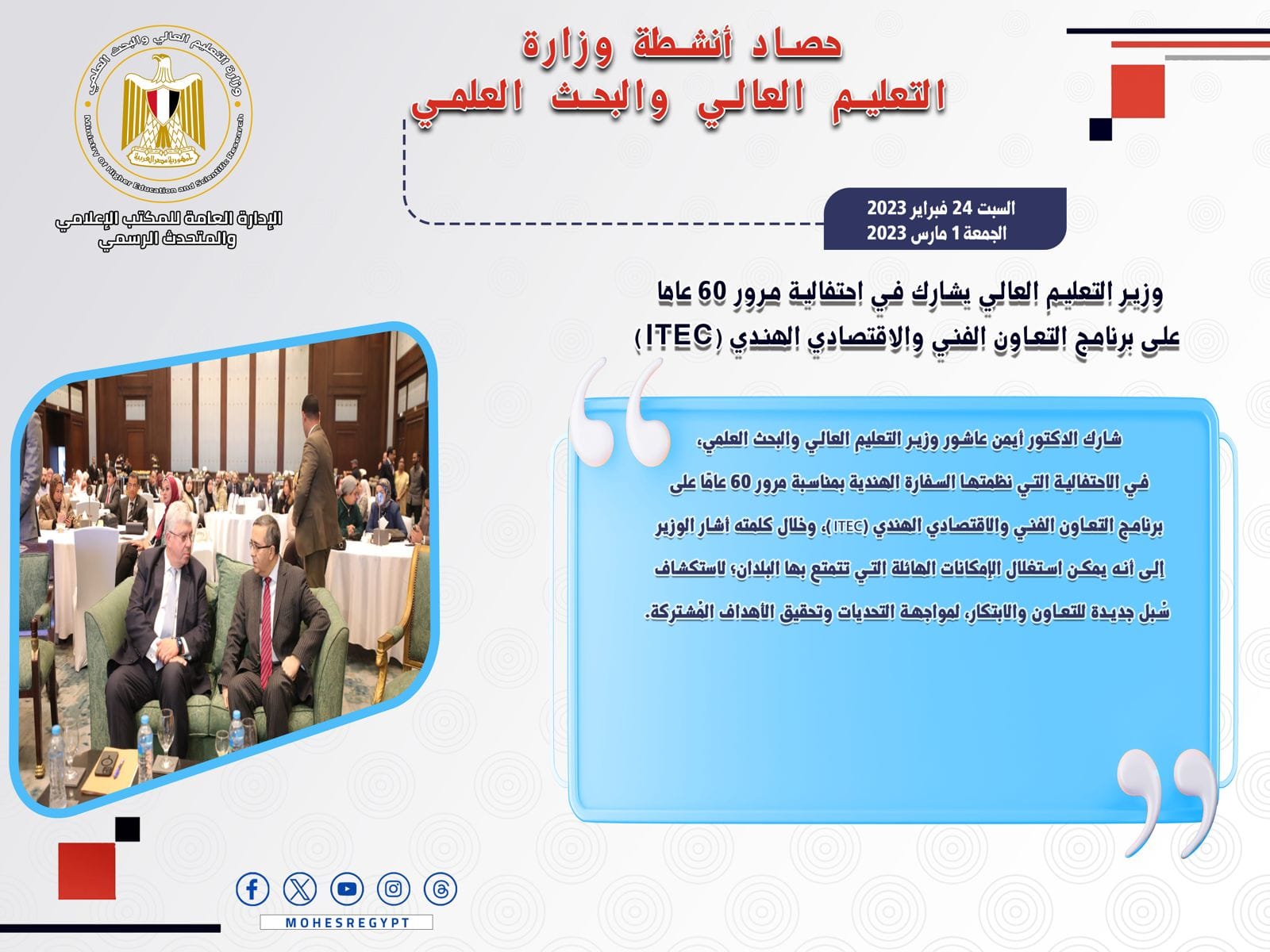 9) شارك الدكتور أيمن عاشور وزير التعليم العالي والبحث العلمي، في الاحتفالية التي نظمتها السفارة الهندية بمناسبة مرور 60 عامًا على برنامج التعاون الفني والاقتصادي الهندي (ITEC)، وخلال كلمته أشار الوزير إلى أنه يمكن استغلال الإمكانات الهائلة التي تتمتع بها البلدان؛ لاستكشاف سُبل جديدة للتعاون والابتكار، لمواجهة التحديات وتحقيق الأهداف المُشتركة.