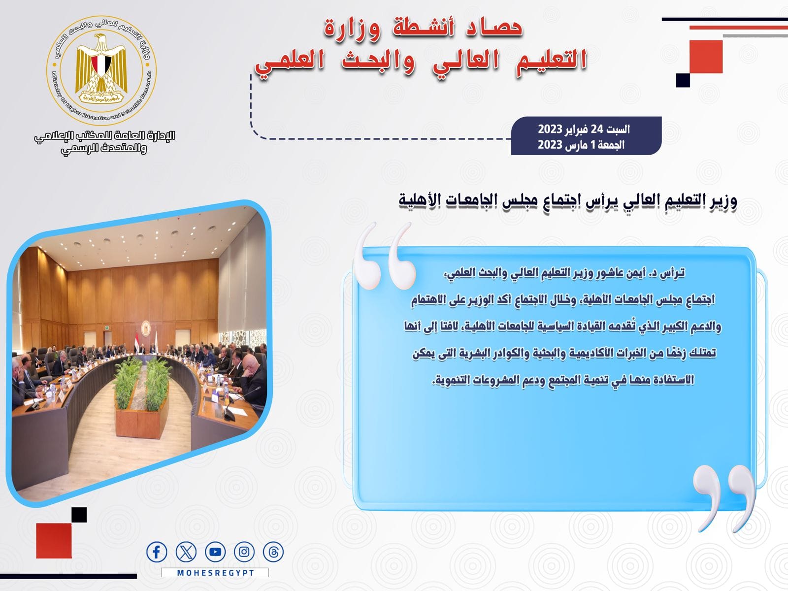 أصدرت الإدارة العامة للمكتب الإعلامي والمتحدث الرسمي لوزارة التعليم العالي والبحث العلمي تقريراً حول أداء أنشطة الوزارة خلال أسبوع في الفترة من 24 فبراير وحتى 2 مارس وكان على النحو الآتي: